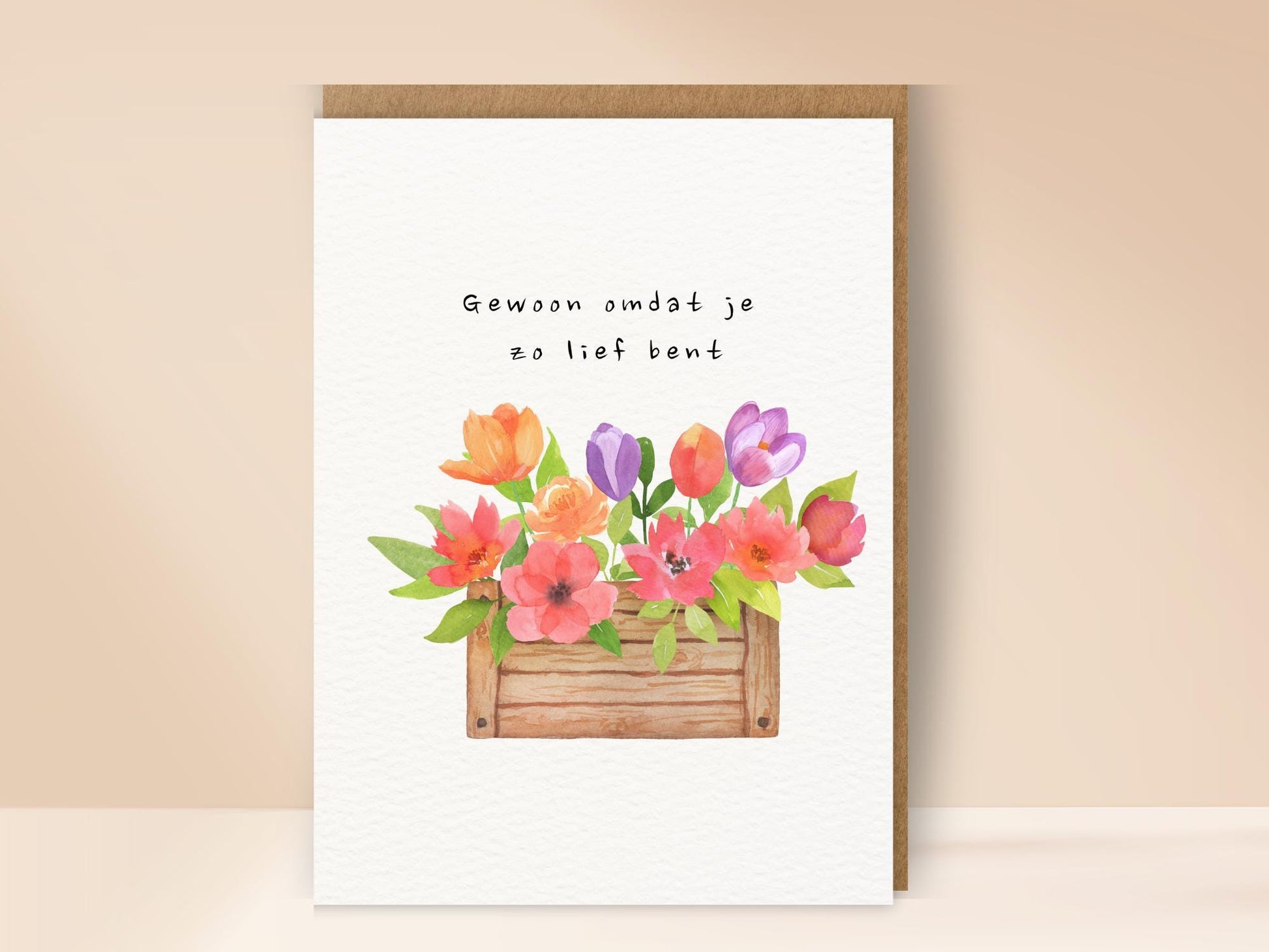 Een vrolijke kaart met kleurrijke bloemen in een houten bak. Perfect om zomaar iemand blij te maken of een lieve boodschap te sturen. Geschikt voor een vriend(in), partner of familielid die je wilt verrassen.