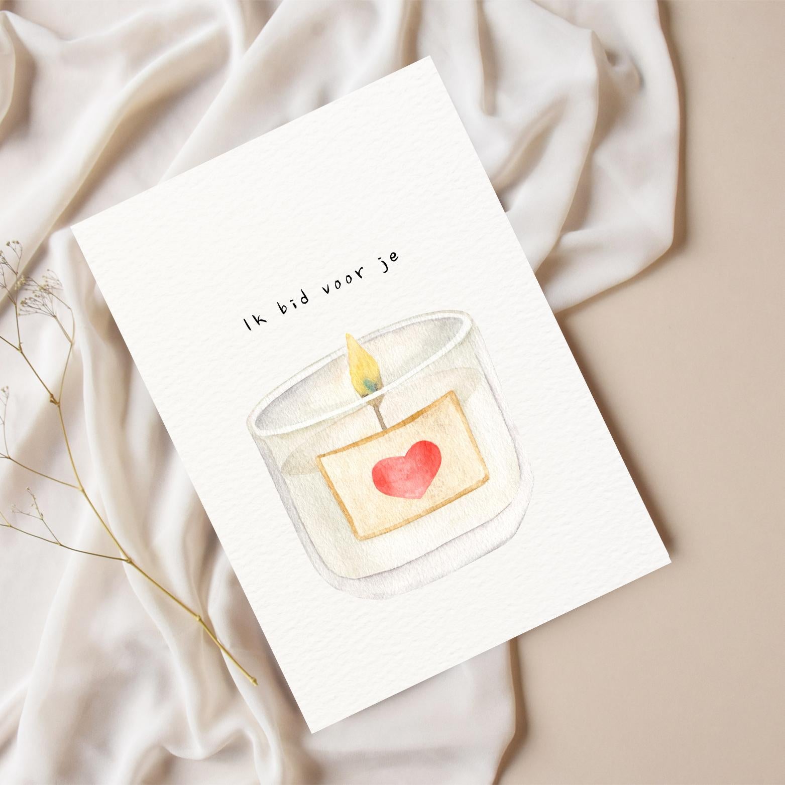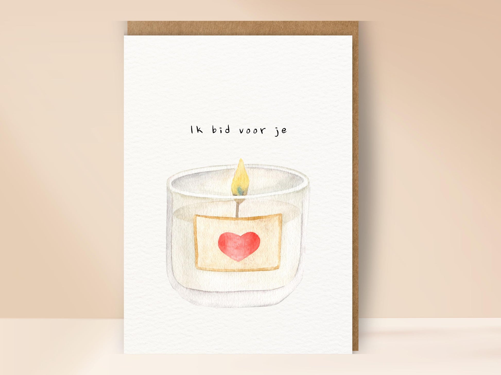 Een ingetogen en liefdevolle kaart met een kaars en de tekst “Ik bid voor je”. Perfect om steun, troost en gebed aan te bieden in moeilijke tijden. Het zachte aquarelontwerp geeft een warme en serene uitstraling, ideaal voor condoleance, sterkte of christelijke gelegenheden.