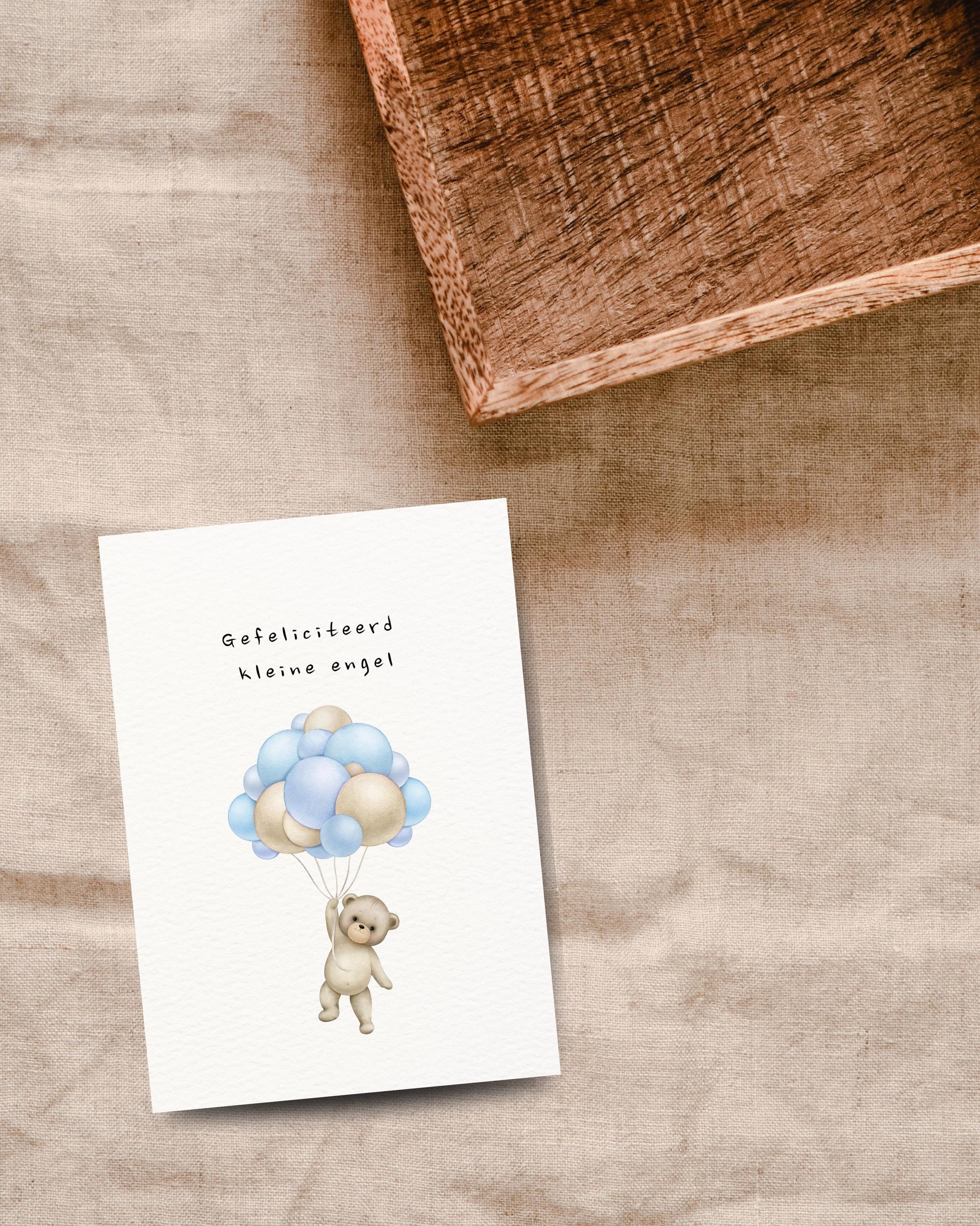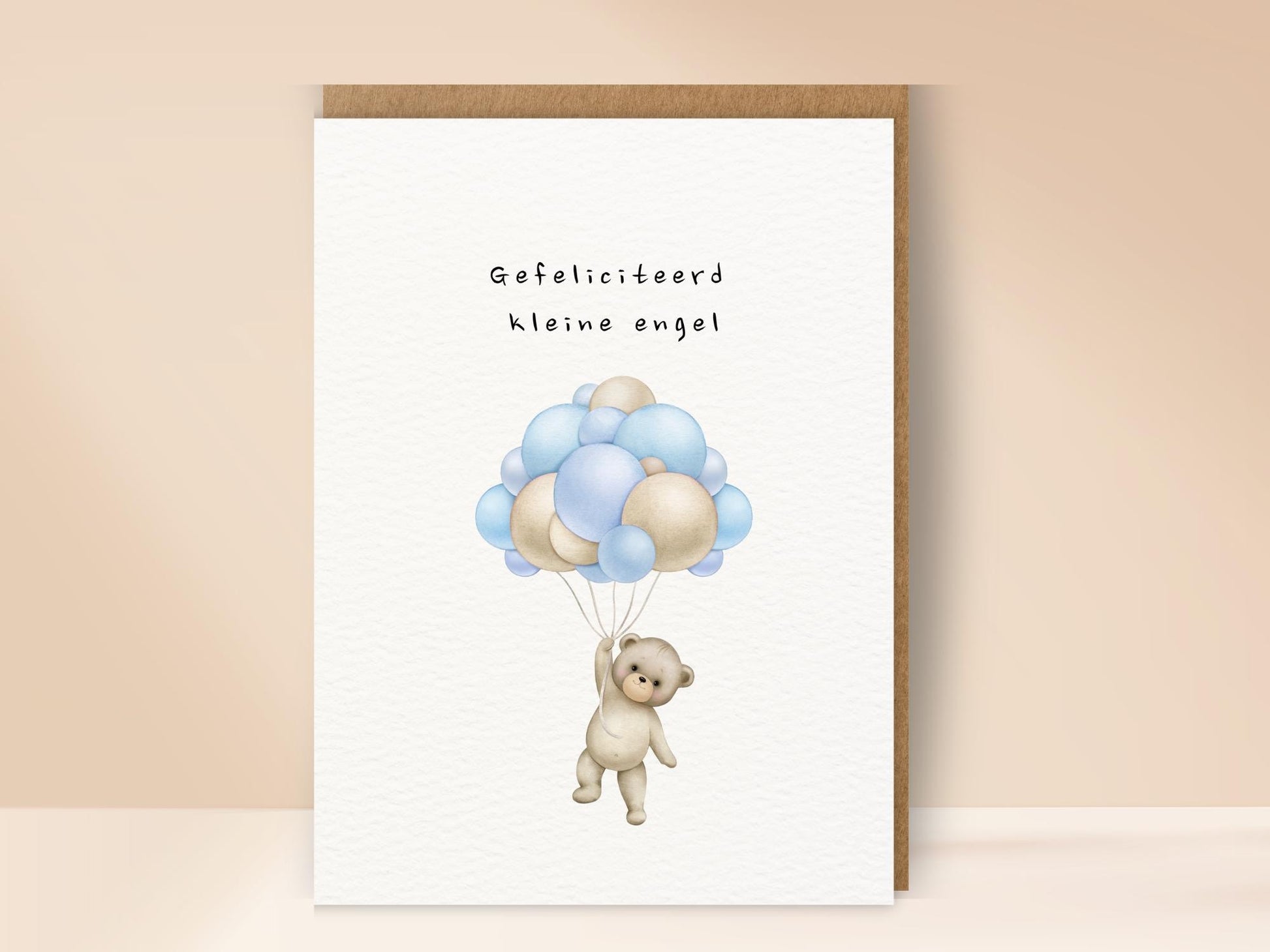 Een lieve christelijke geboortekaart met een schattige beer die ballonnen vasthoudt en de tekst “Gefeliciteerd kleine engel”. Perfect om ouders te feliciteren met de geboorte van hun zoon of dochter. De zachte, minimalistische stijl maakt de kaart tijdloos en geschikt voor zowel jongens als meisjes.