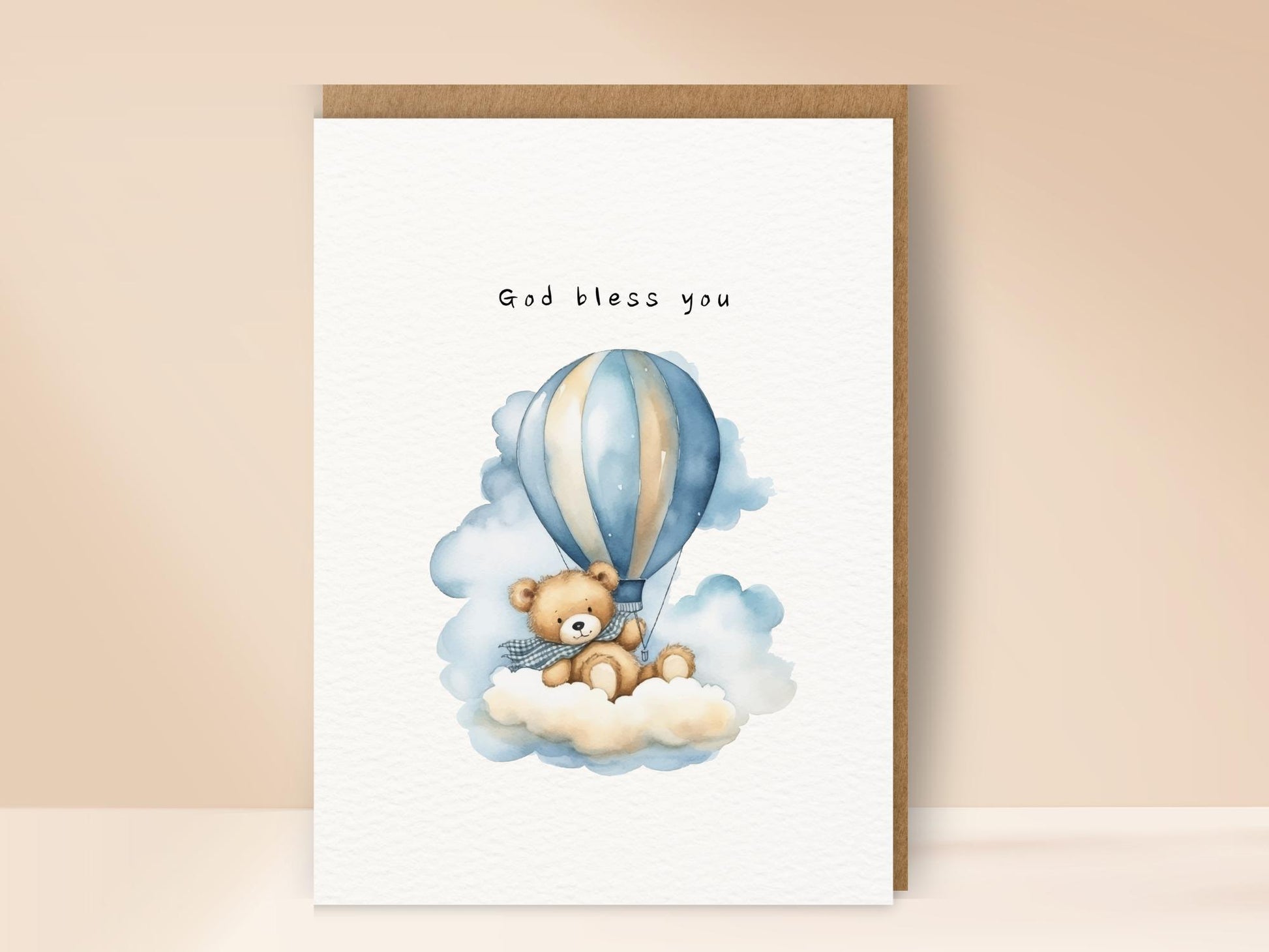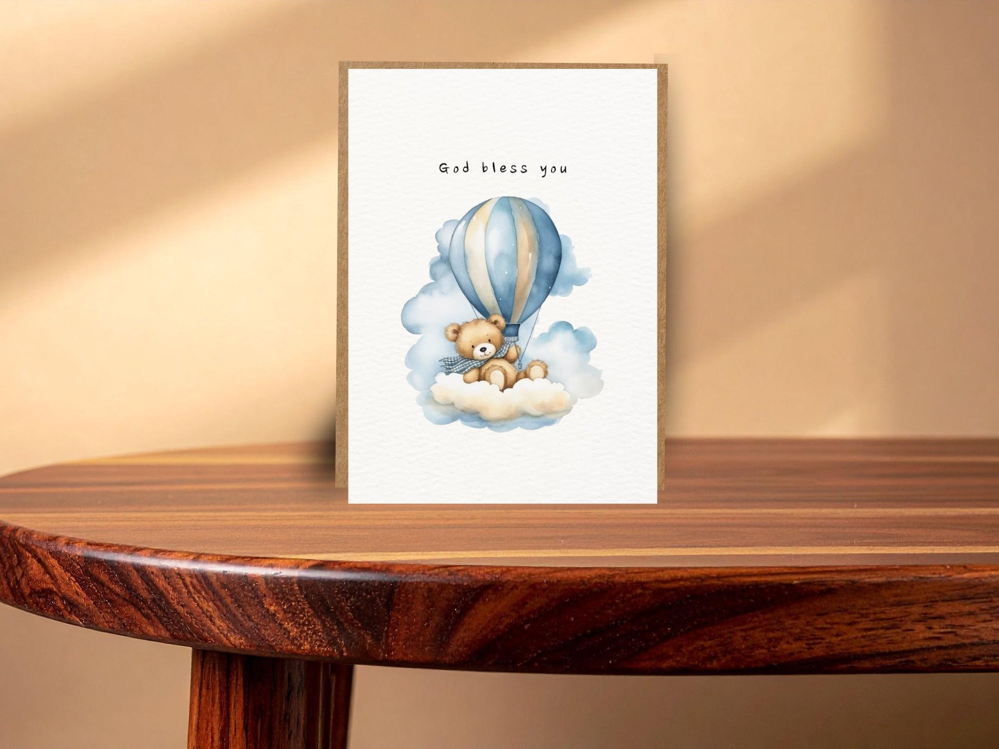 Christelijke kaart met beer in luchtballon en tekst “God bless you”. Een zachte en liefdevolle kaart om iemand een zegen en bemoediging mee te geven.
