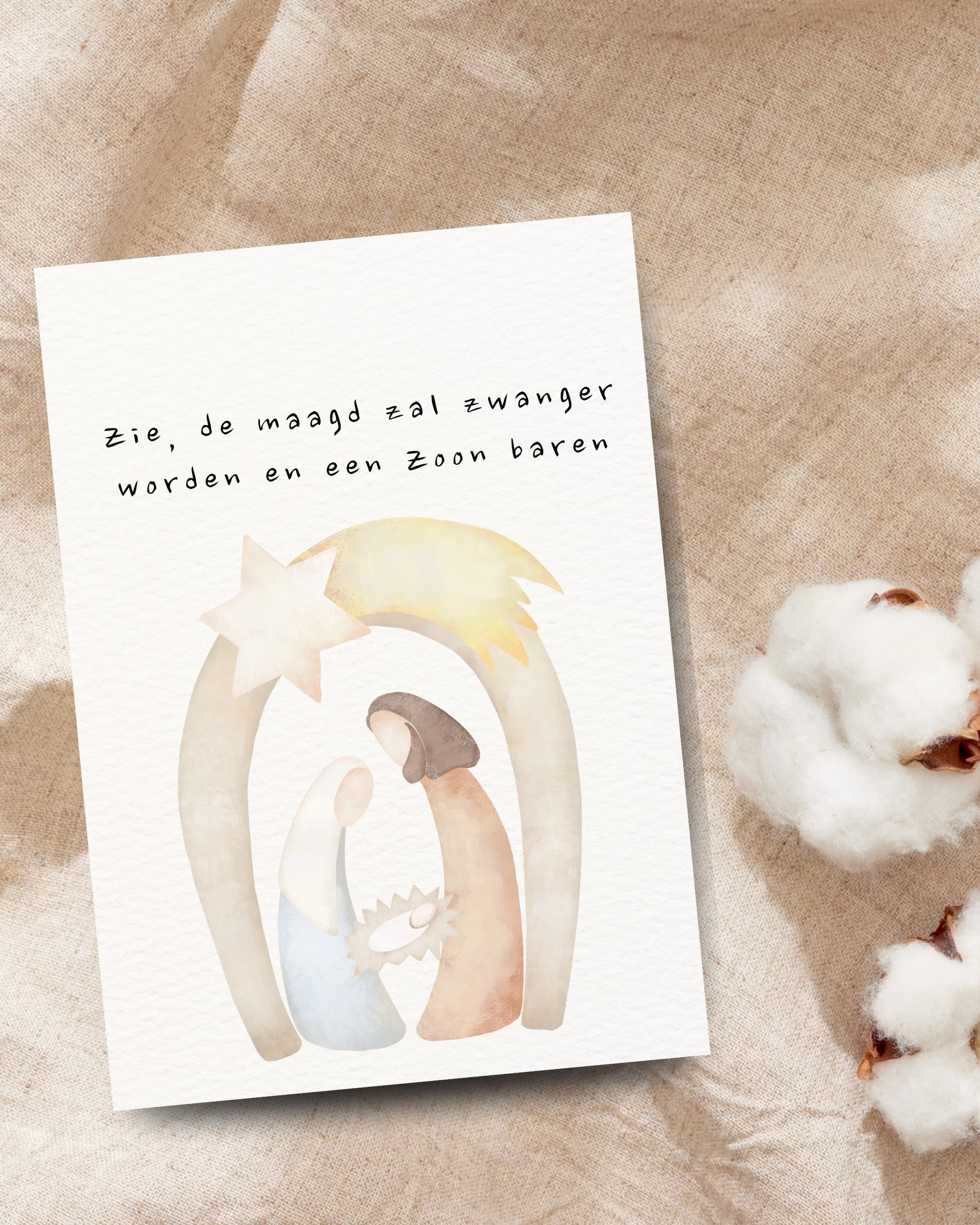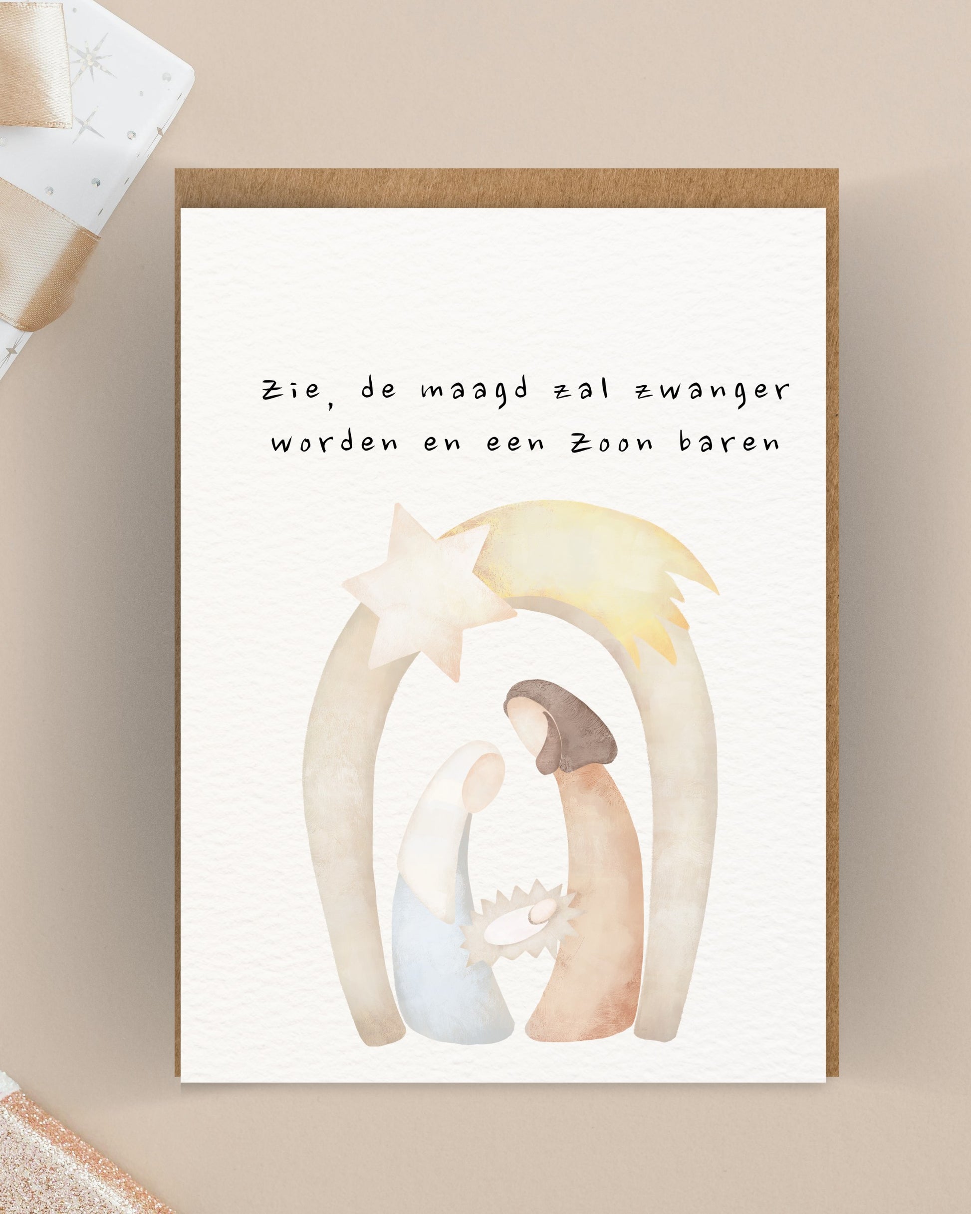 Een bijzondere kerstkaart met de tekst “Zie, de maagd zal zwanger worden en een Zoon baren”. Een prachtige kaart om het kerstverhaal te delen.