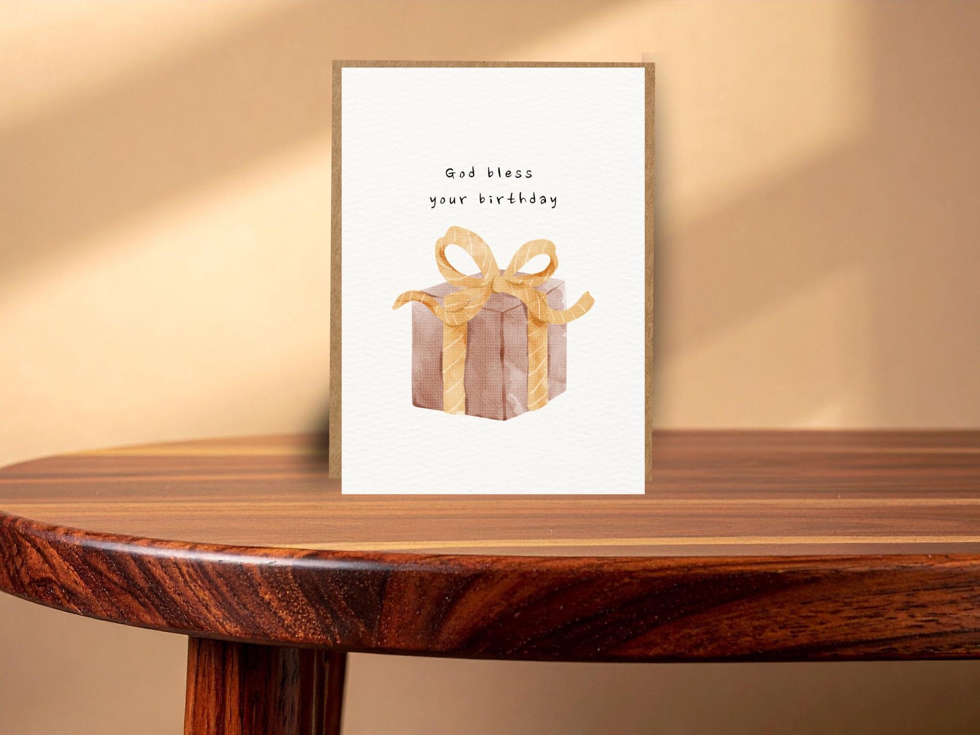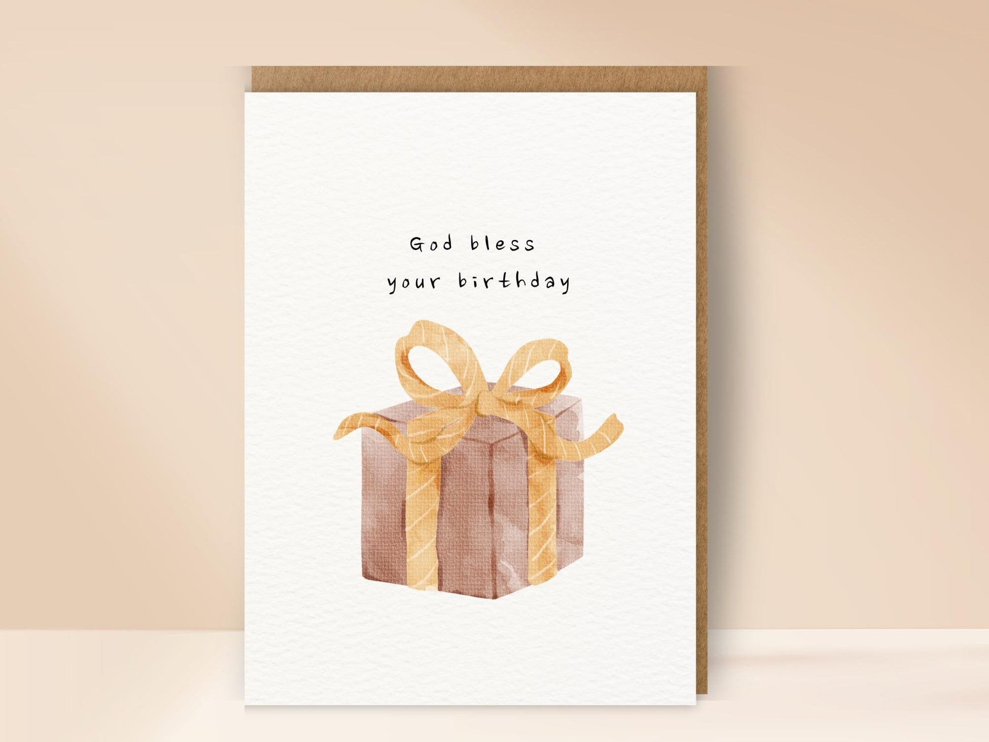 Christelijke verjaardagskaart met cadeau en strik. Een vrolijk en liefdevol kaartje om iemand Gods zegen toe te wensen op zijn of haar verjaardag.