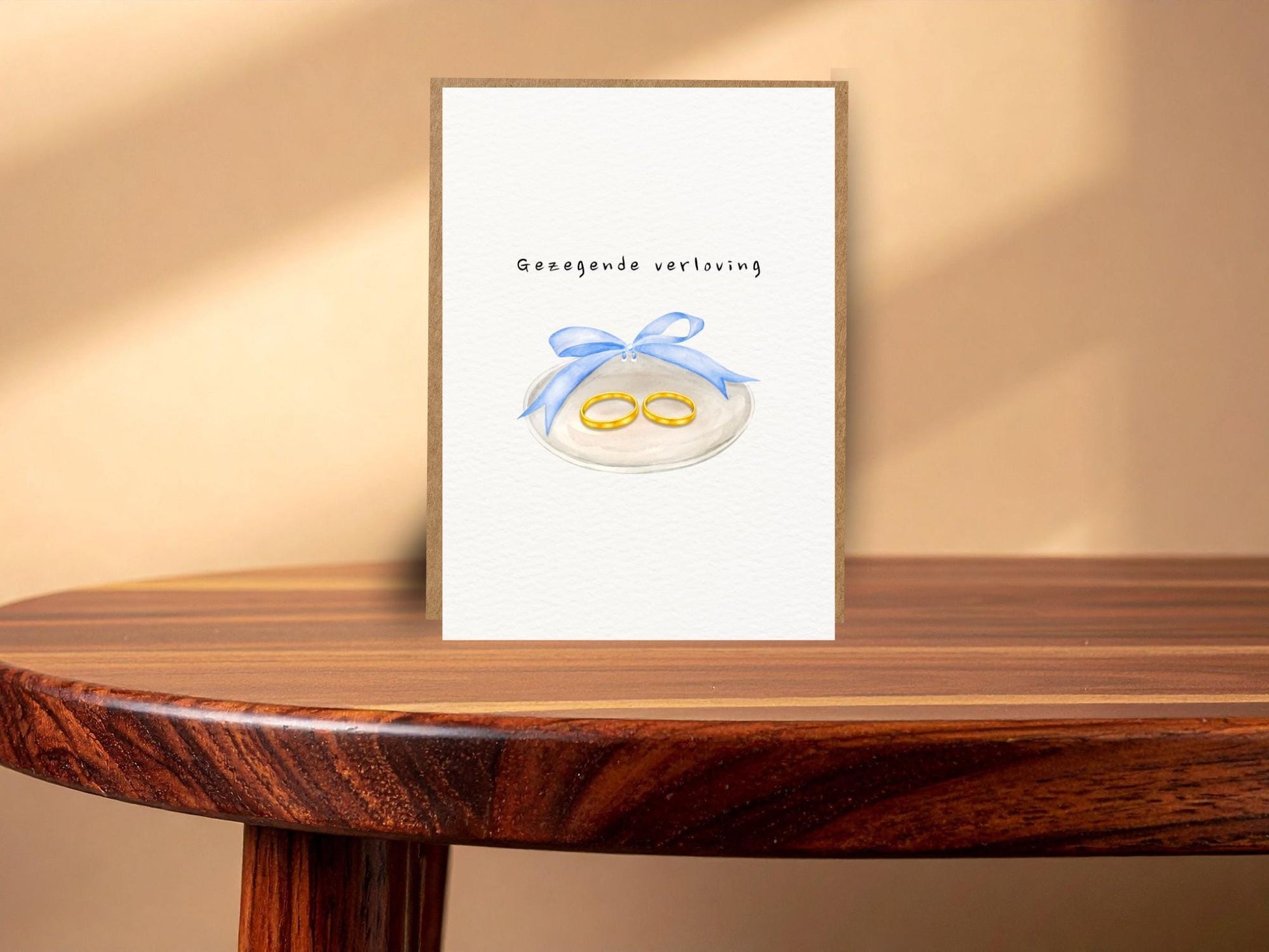 Christelijke verlovingskaart met ringen en blauwe strik. Een betekenisvol en stijlvol kaartje om een verloofd stel Gods zegen toe te wensen.