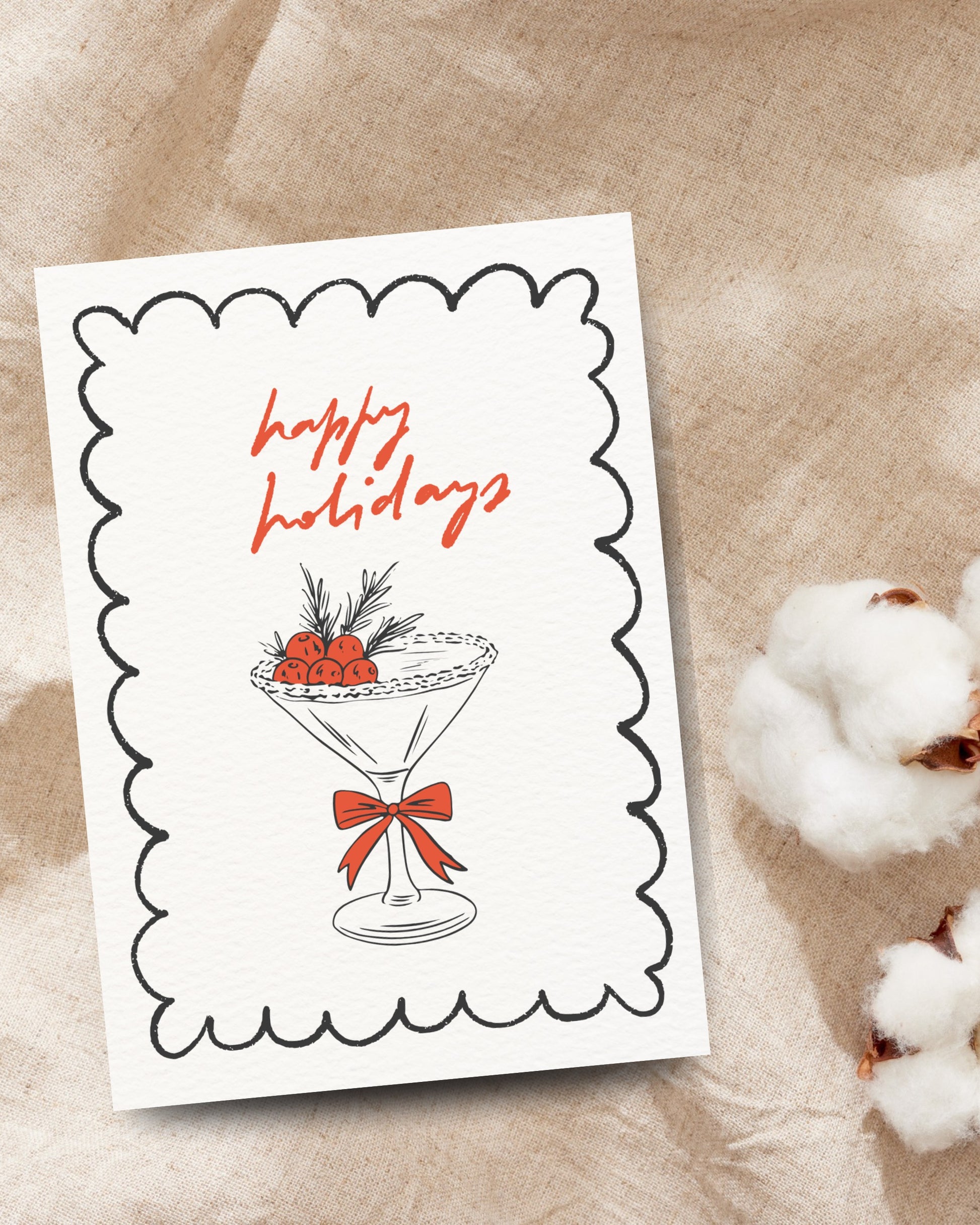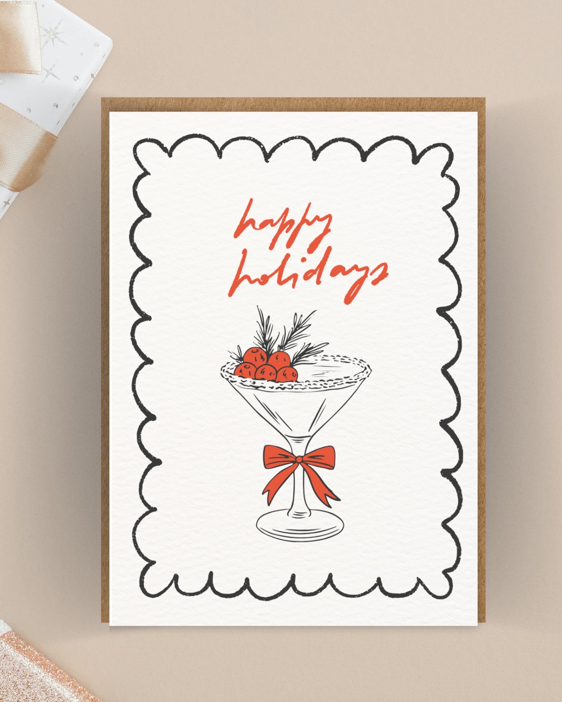 Unieke feestdagenkaart met een getekend cocktailglas, besjes en een rode strik. De tekst “happy holidays” maakt hem perfect voor een gezellige wintergroet of eindejaarswens.
