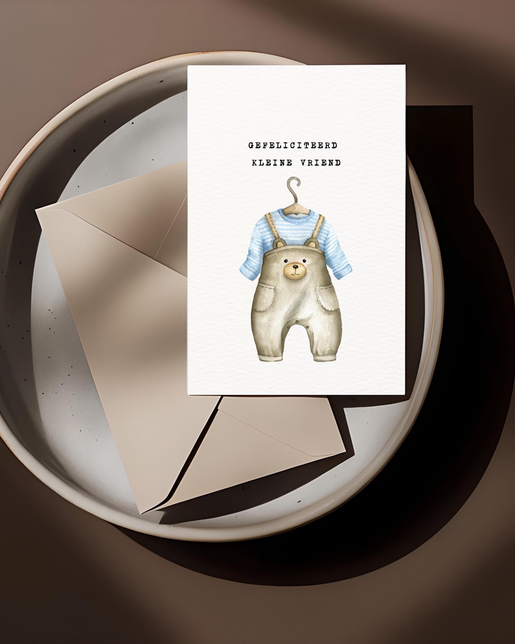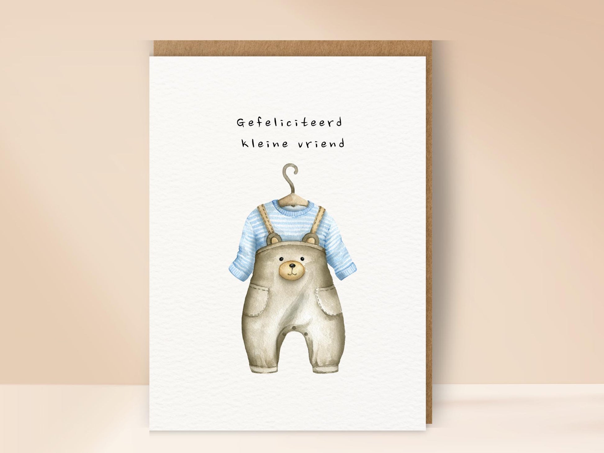 Een schattige geboortekaart voor een jongen met een illustratie van een berenpakje. Perfect om ouders te feliciteren met hun kleine vriend.