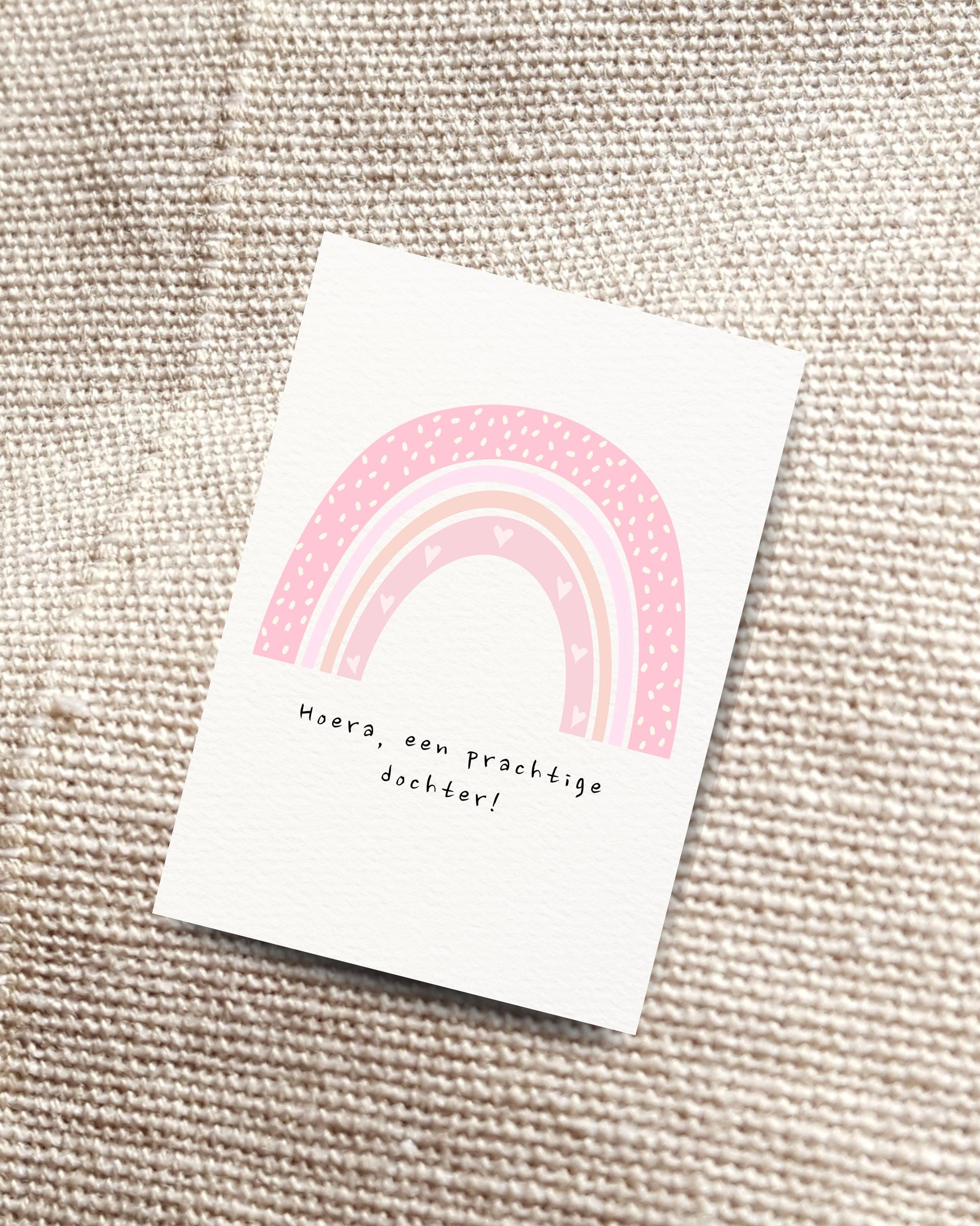 Een vrolijke geboortekaart voor een meisje met een roze regenboog en de tekst “Hoera, een prachtige dochter!”. Perfect om ouders te feliciteren met hun nieuwe kindje.