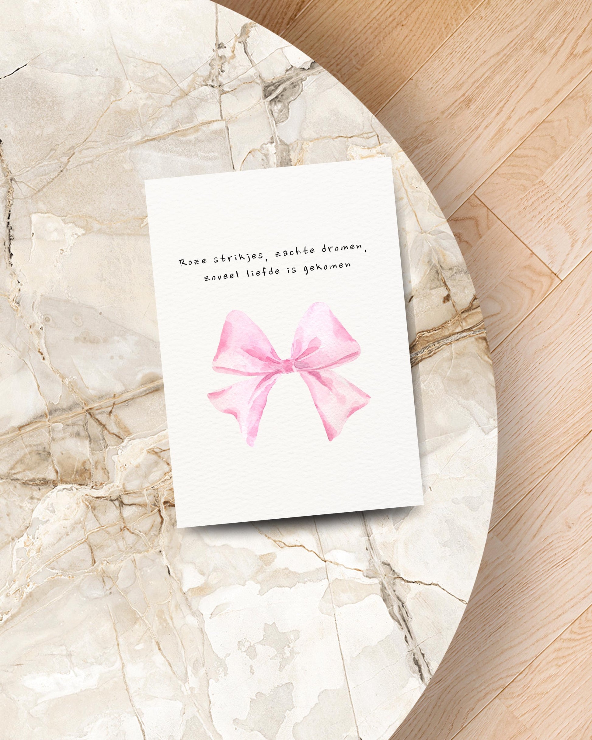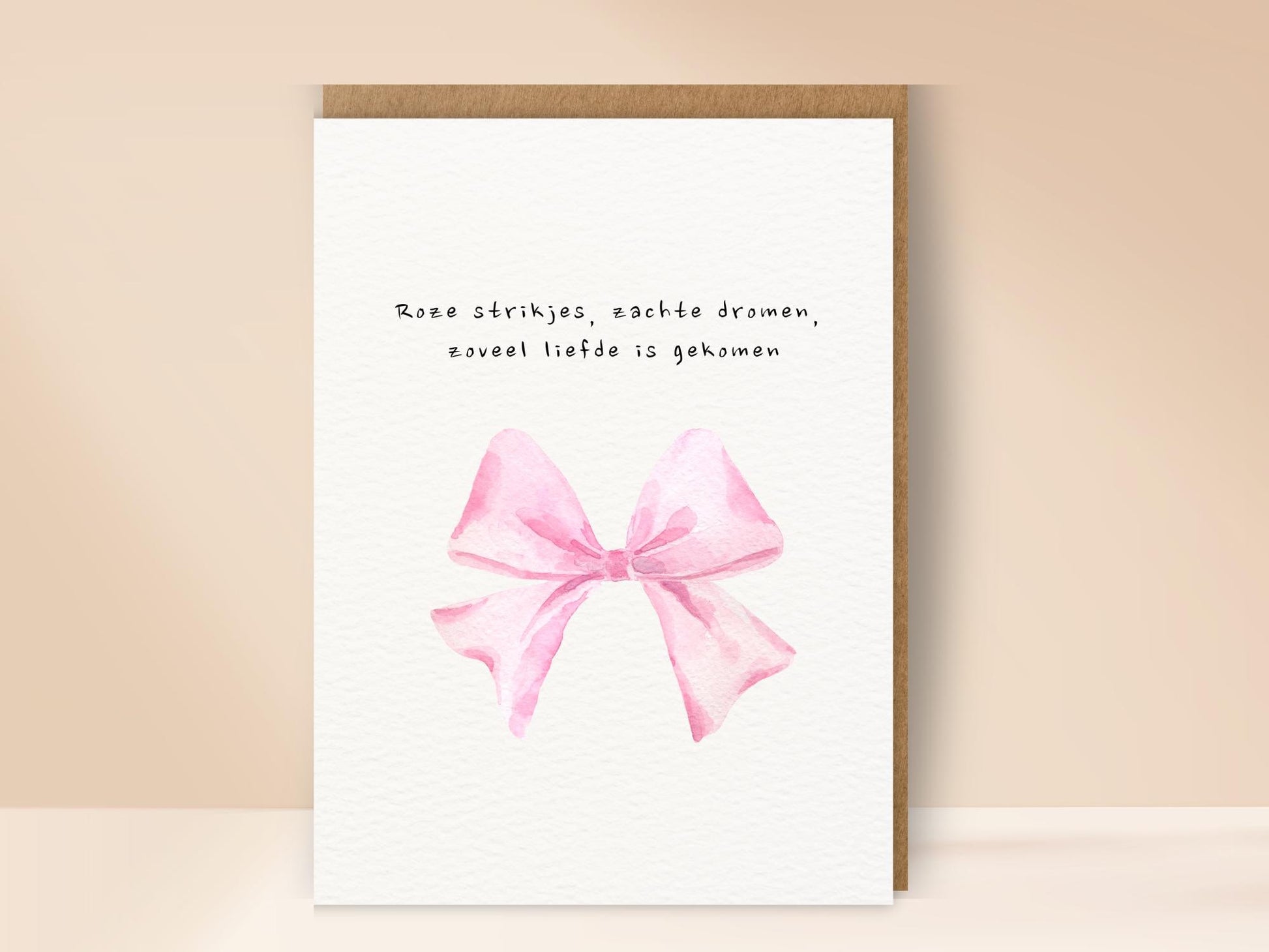 Een lieve geboortekaart voor een meisje met een roze strik en de tekst “Roze strikjes, zachte dromen, zoveel liefde is gekomen”. Perfect om ouders te feliciteren met hun dochter.
