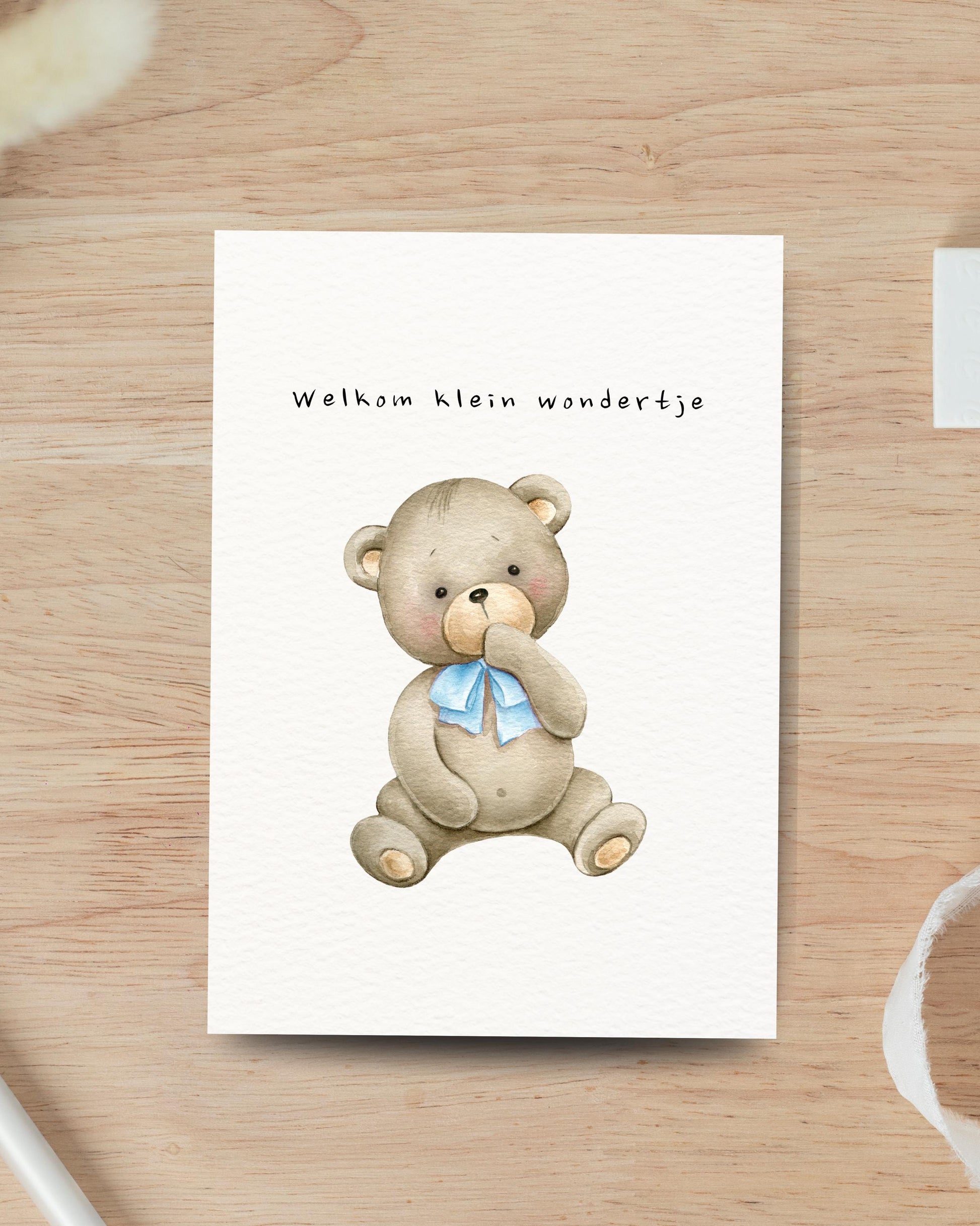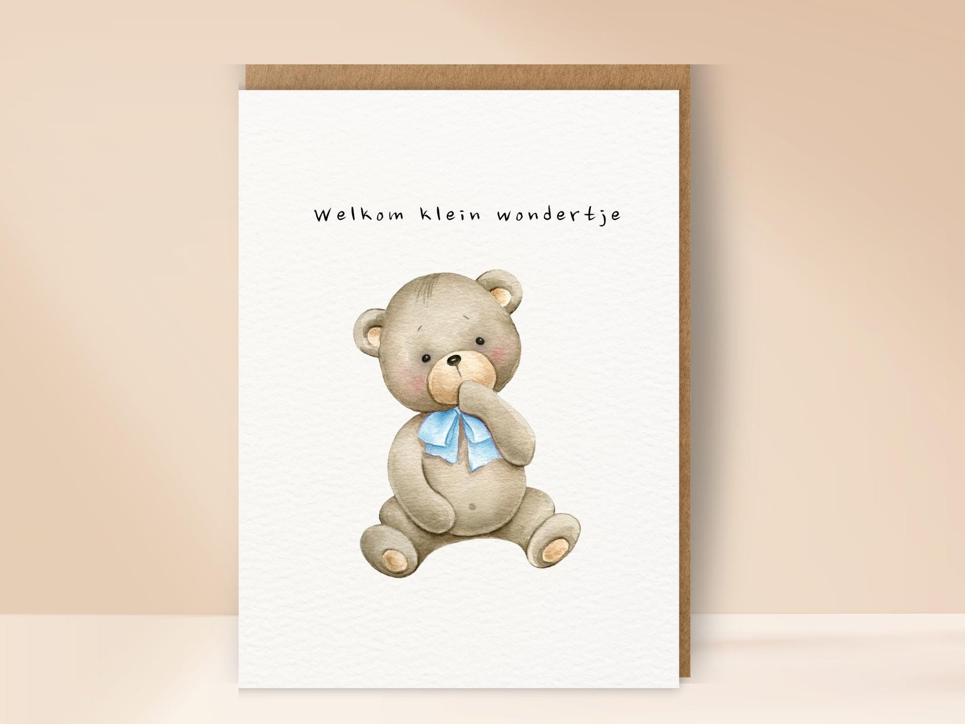 Een zachte en lieve geboortekaart met een knuffelbeer en de tekst “Welkom klein wondertje”. Perfect om ouders te feliciteren met de geboorte van hun kindje.