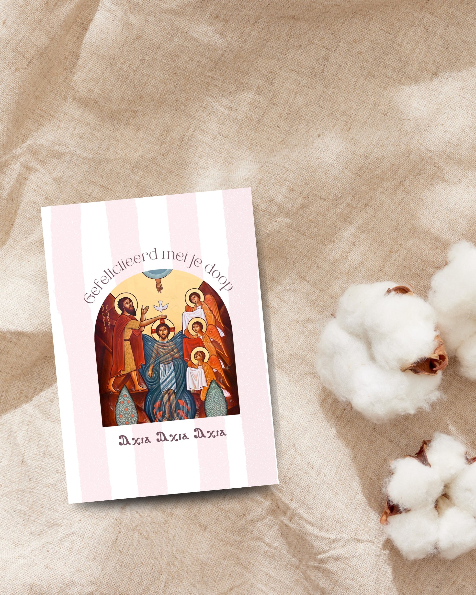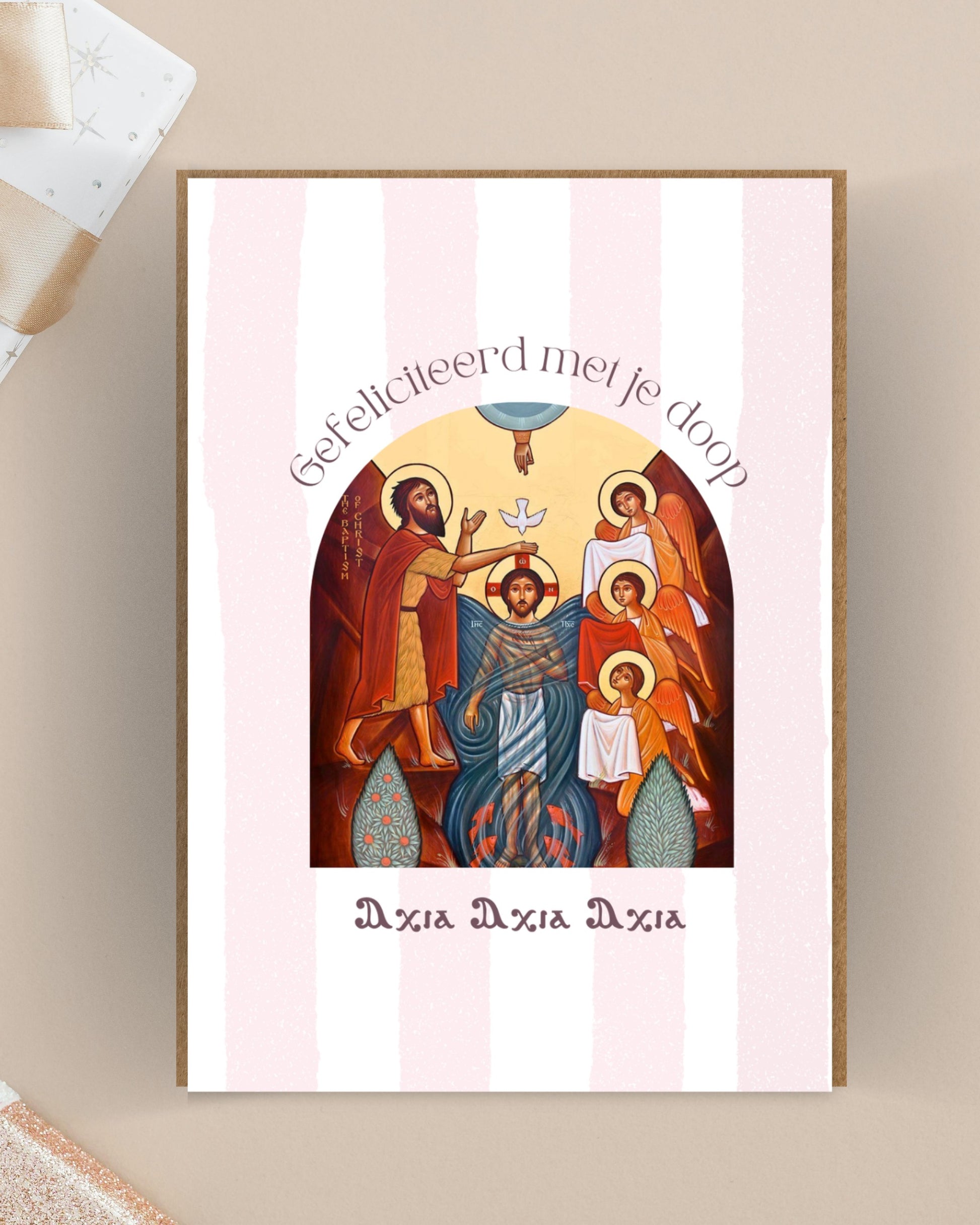 Een stijlvolle en liefdevolle kaart om een doop te vieren. Met zachte pastelkleuren en een Koptisch Orthodox icoon van de doop van Christus. Op het kaartje staat Gefeliciteerd met je doop en Axia, wat waardig betekent.