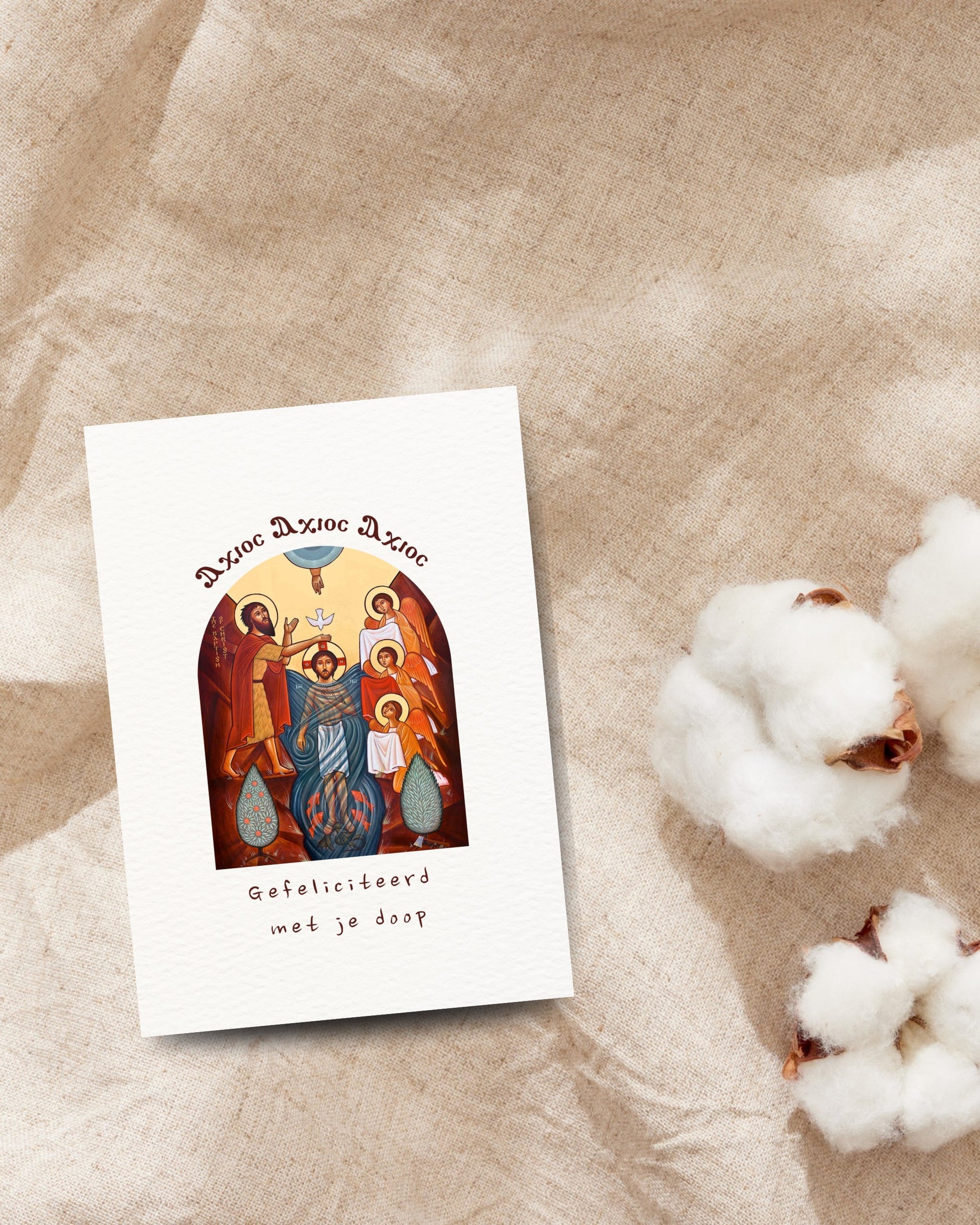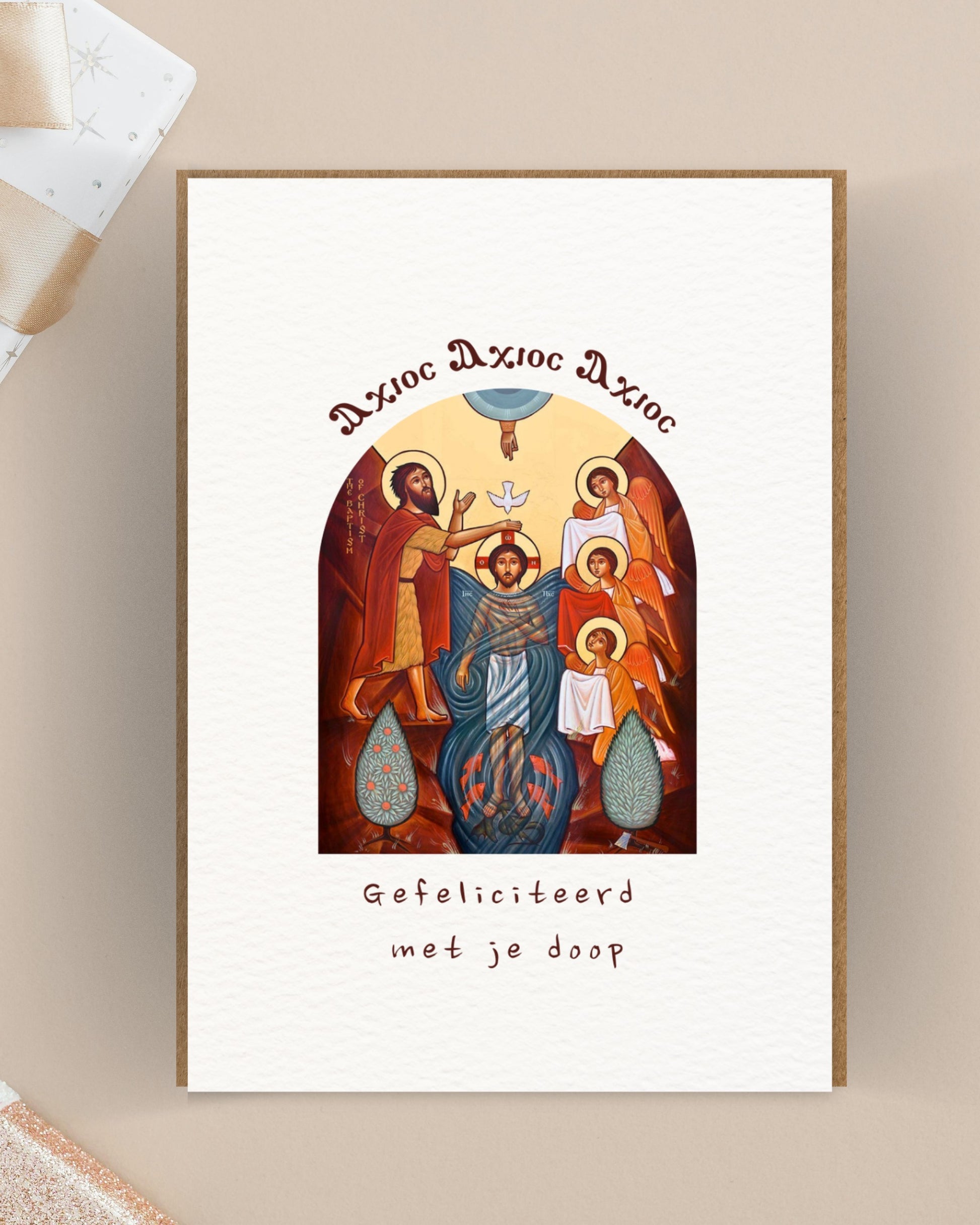 Een stijlvolle en liefdevolle kaart om een doop te vieren. Met een Koptisch Orthodox icoon van de doop van Christus. Op het kaartje staat Gefeliciteerd met je doop en Axios, wat waardig betekent.
