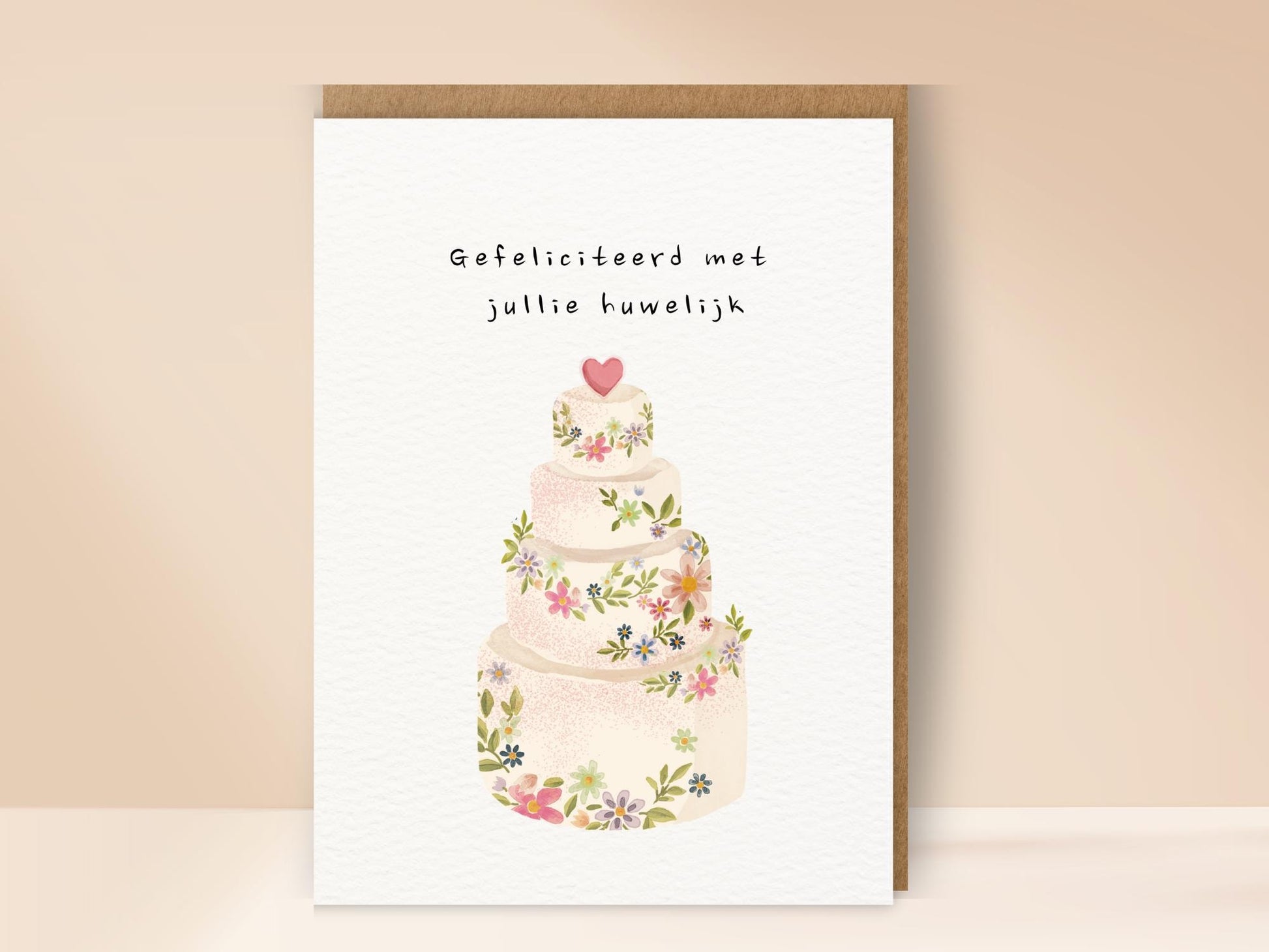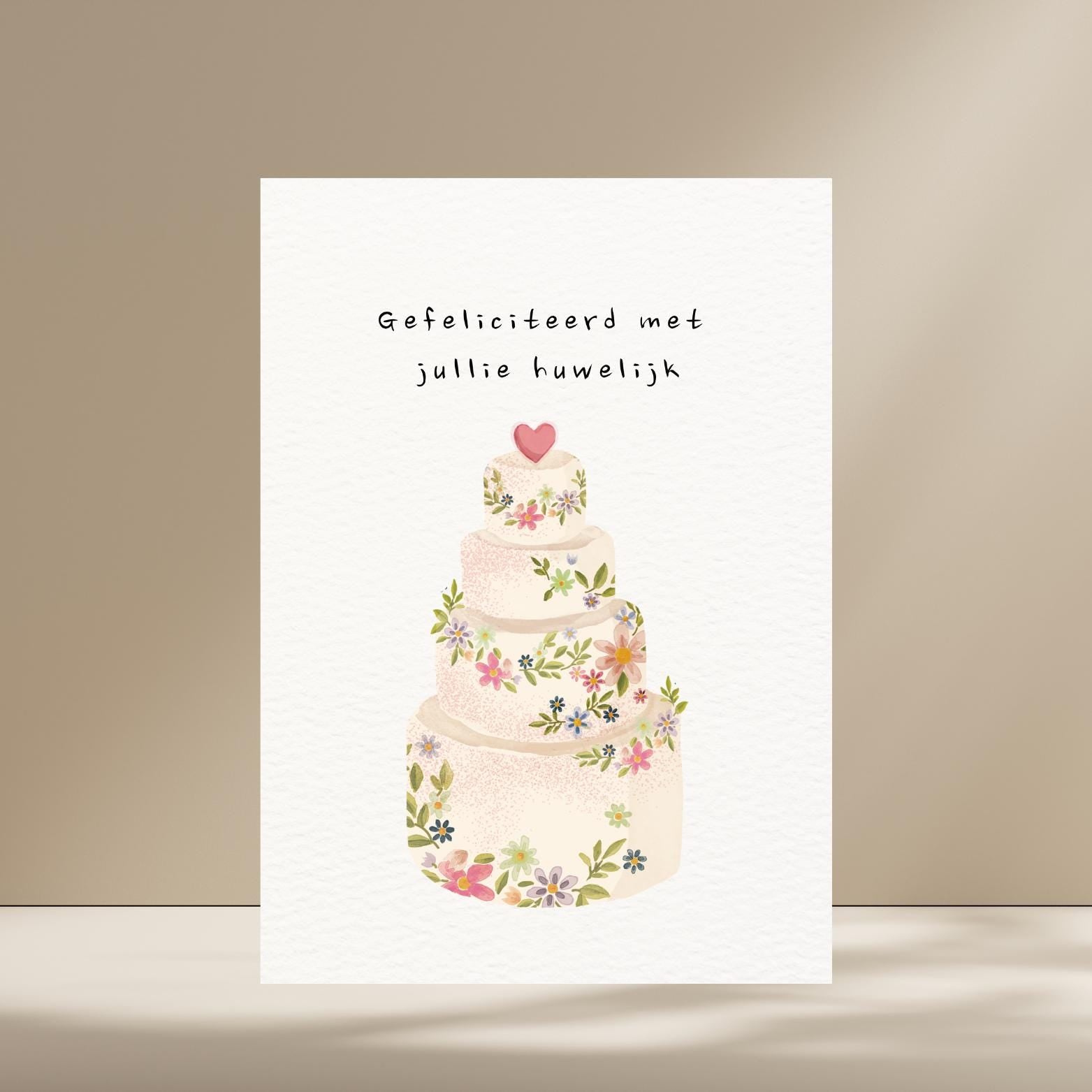 Een elegante huwelijkskaart met een bloemen bruidstaart. Perfect om een bruidspaar te feliciteren op hun grote dag.