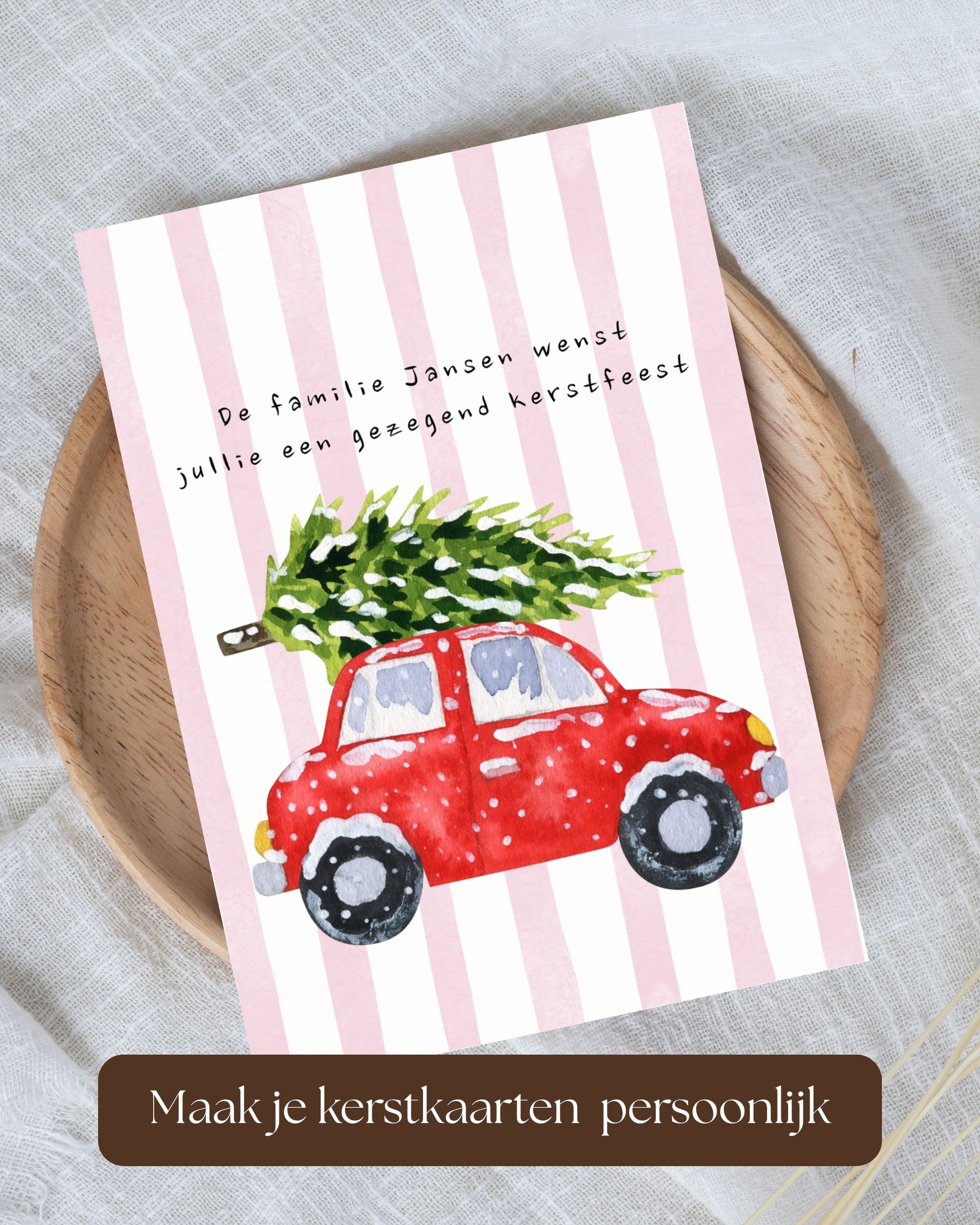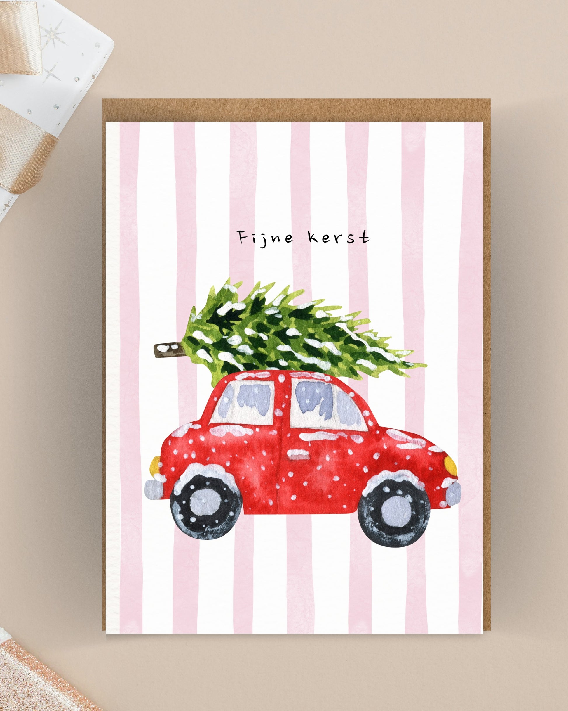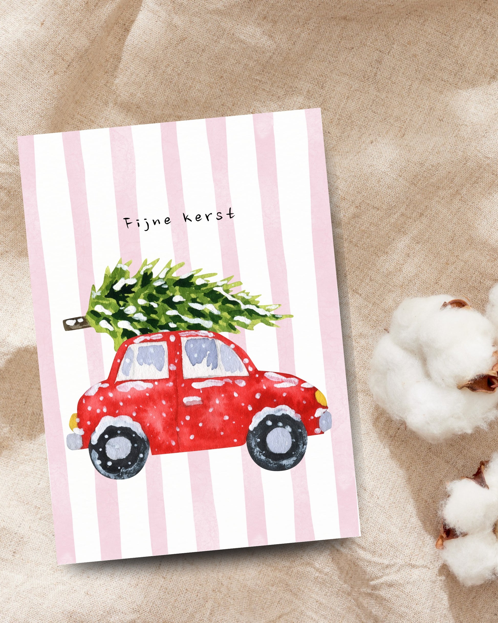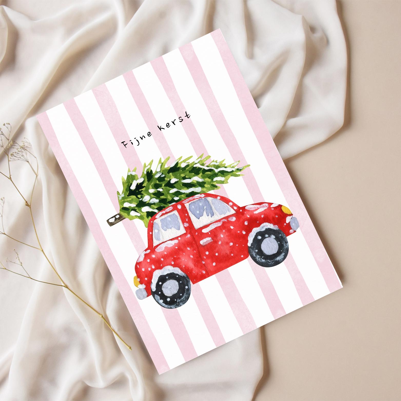 Een nostalgische kerstkaart met een rode auto die een kerstboom vervoert. Perfect om een warme kerstgroet te sturen.
