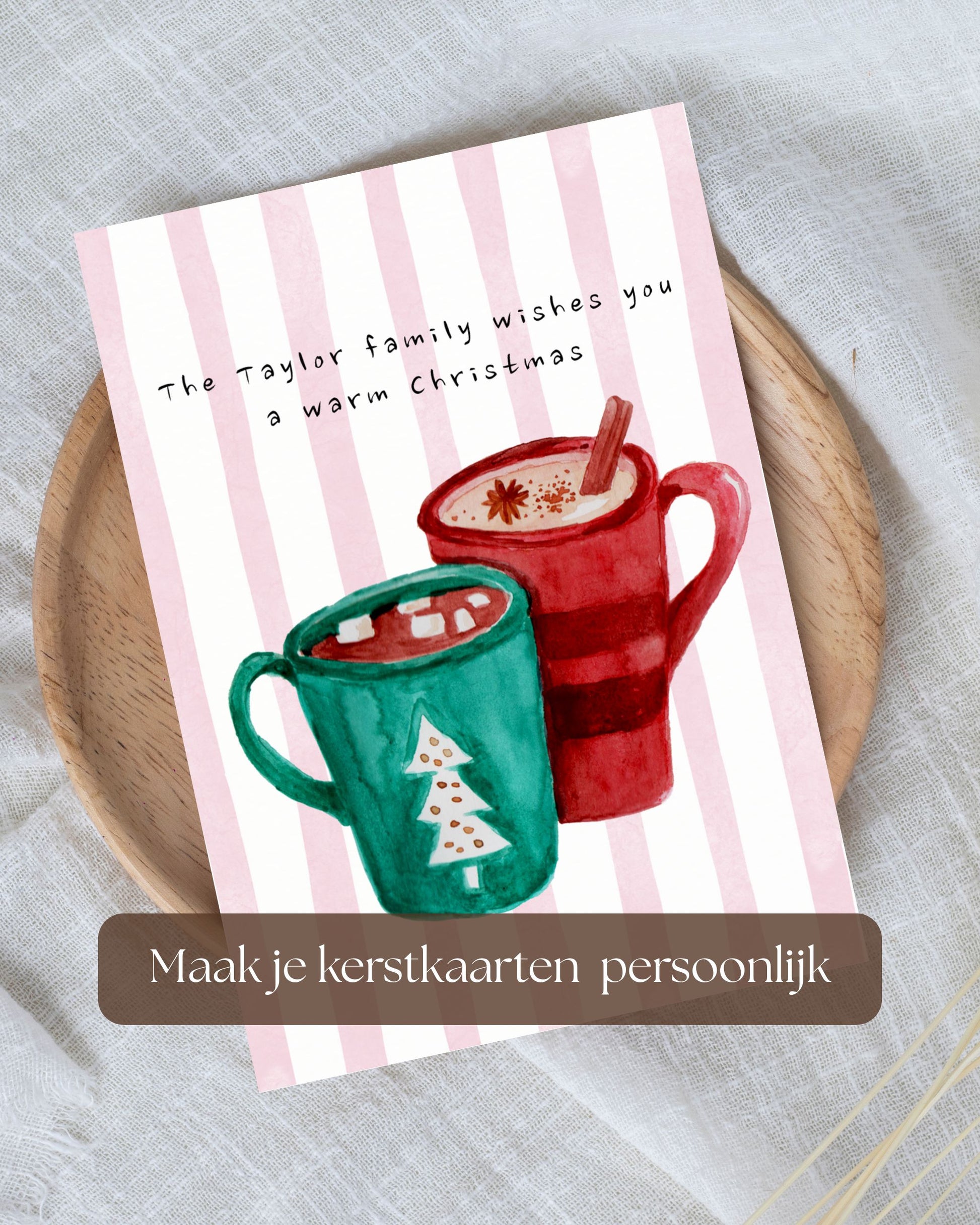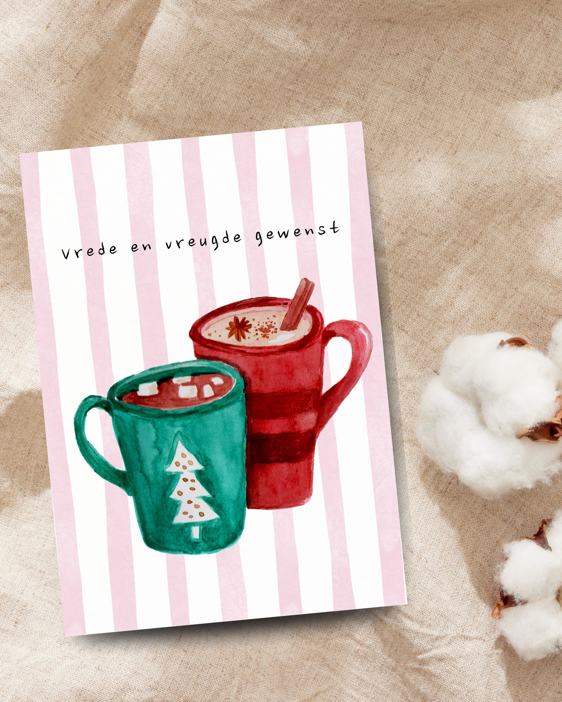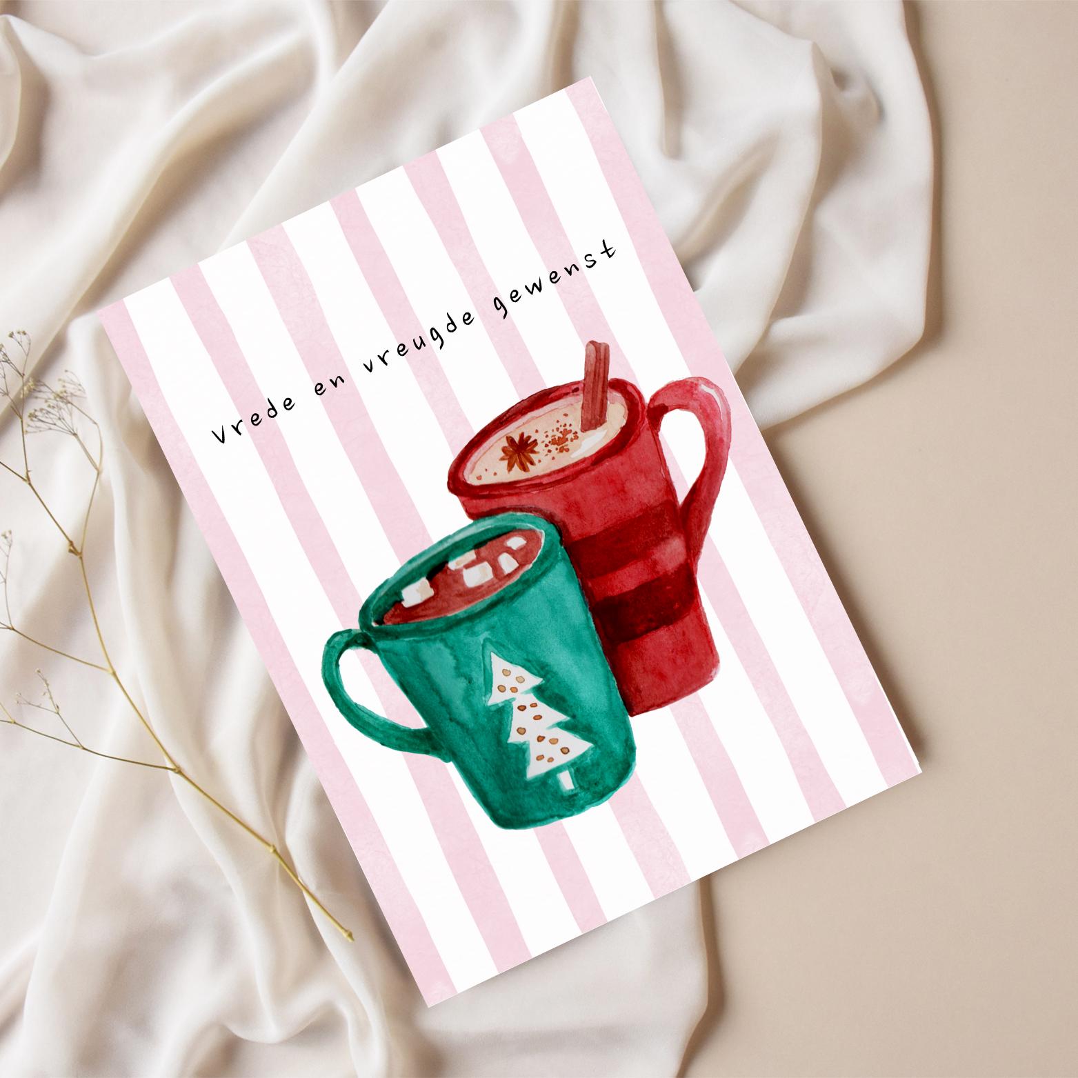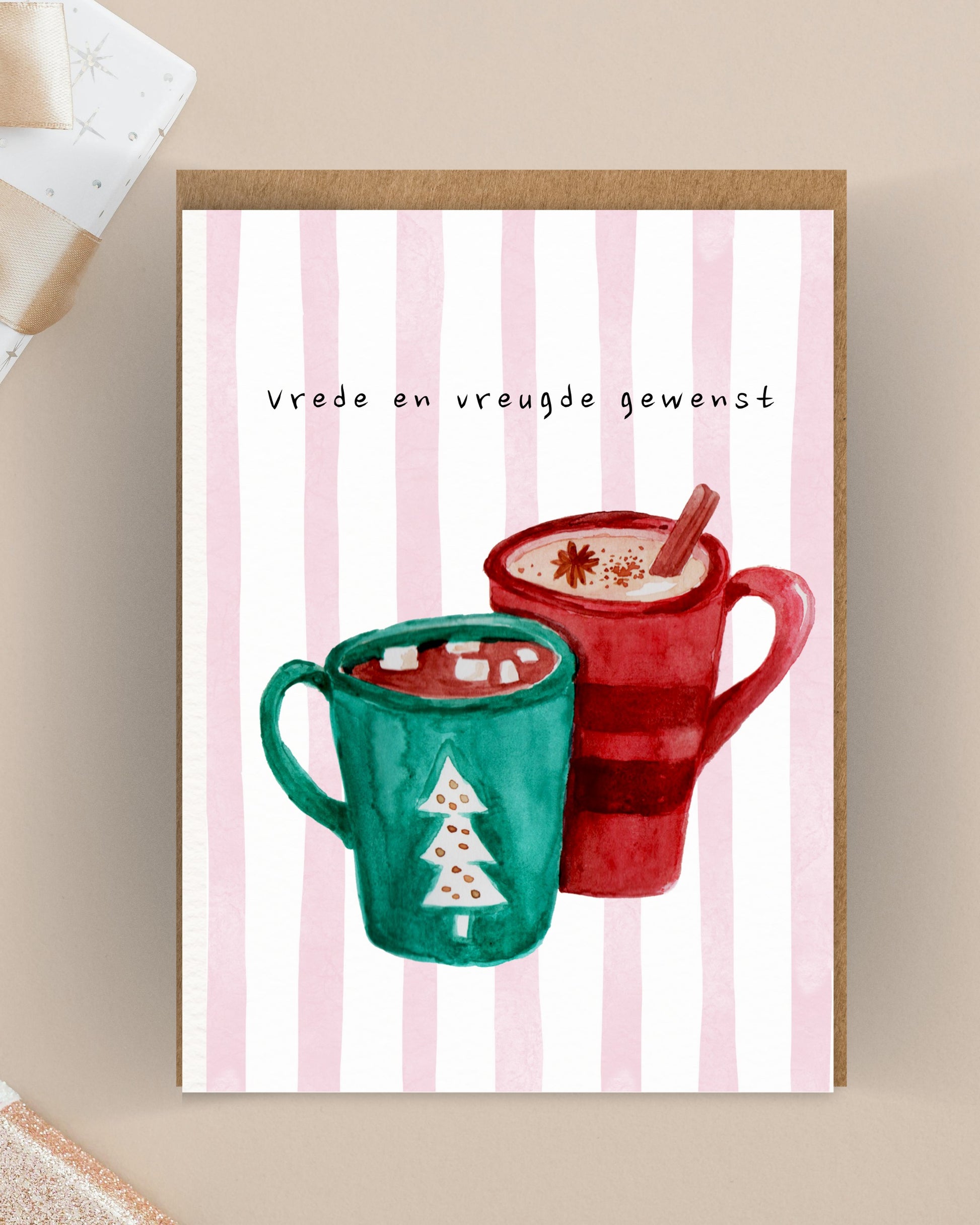 Een knusse kerstkaart met twee mokken warme chocolademelk. Ideaal om vrede, vreugde en warmte te wensen tijdens de feestdagen.
