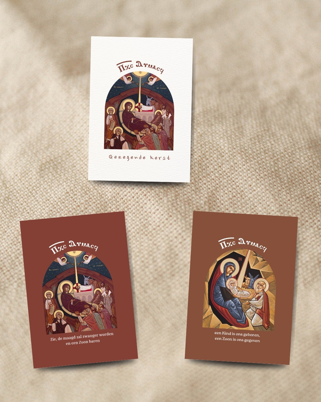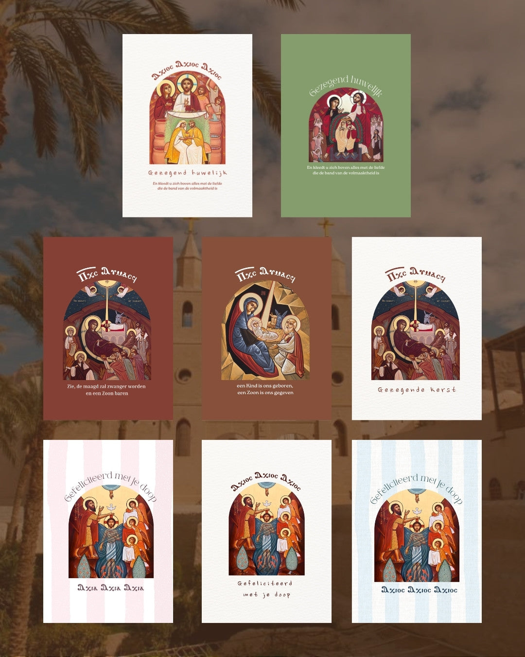 7 van onze Koptische wenskaarten bij elkaar.