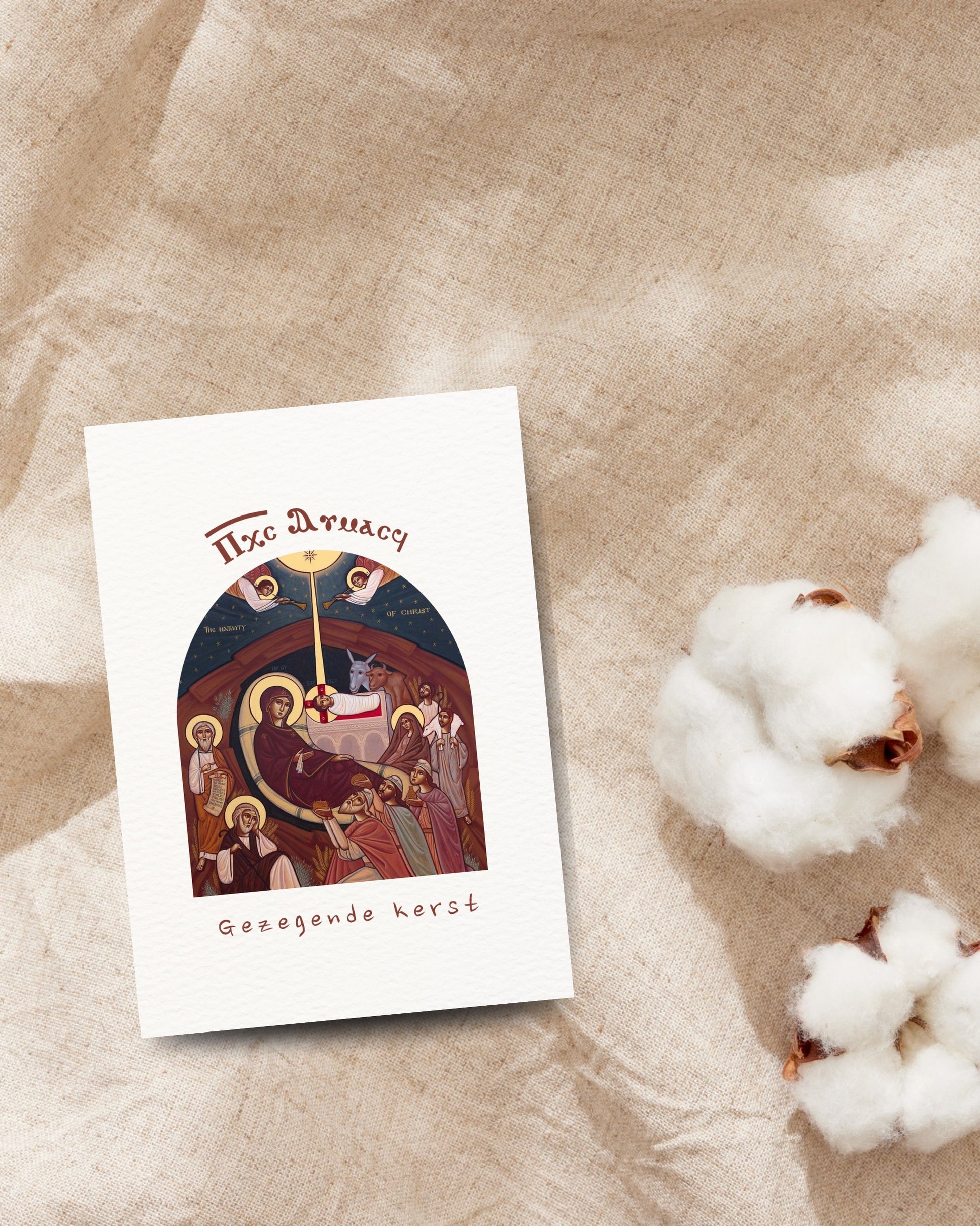Een Koptische kerstkaart met een icoon van de geboorte en de tekst “ⲡ̅ⲭ̅ⲥ̅ ⲁⲩⲙⲁⲥϥ”. Perfect om warme, christelijke kerstgroeten te versturen.