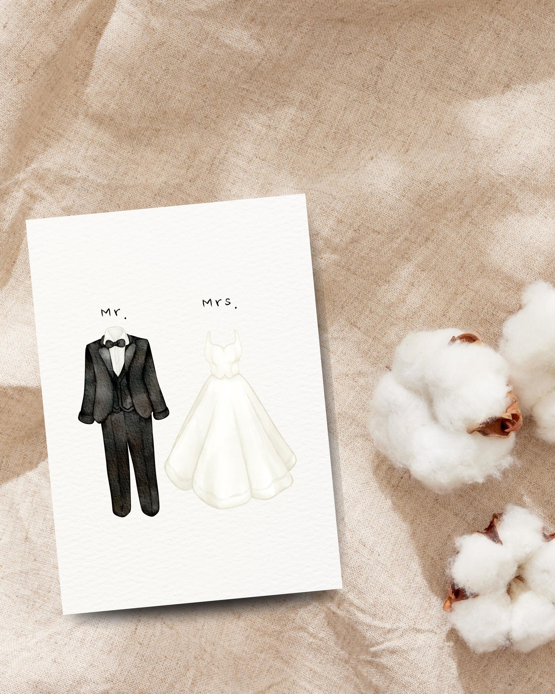 Een stijlvolle huwelijkskaart / bruiloftskaart met een klassieke illustratie van trouwjurk en pak – perfect om een pasgetrouwd stel te feliciteren met hun huwelijk! Deze minimalistische kaart straalt eenvoud en elegantie uit en past bij iedere bruiloftsstijl.