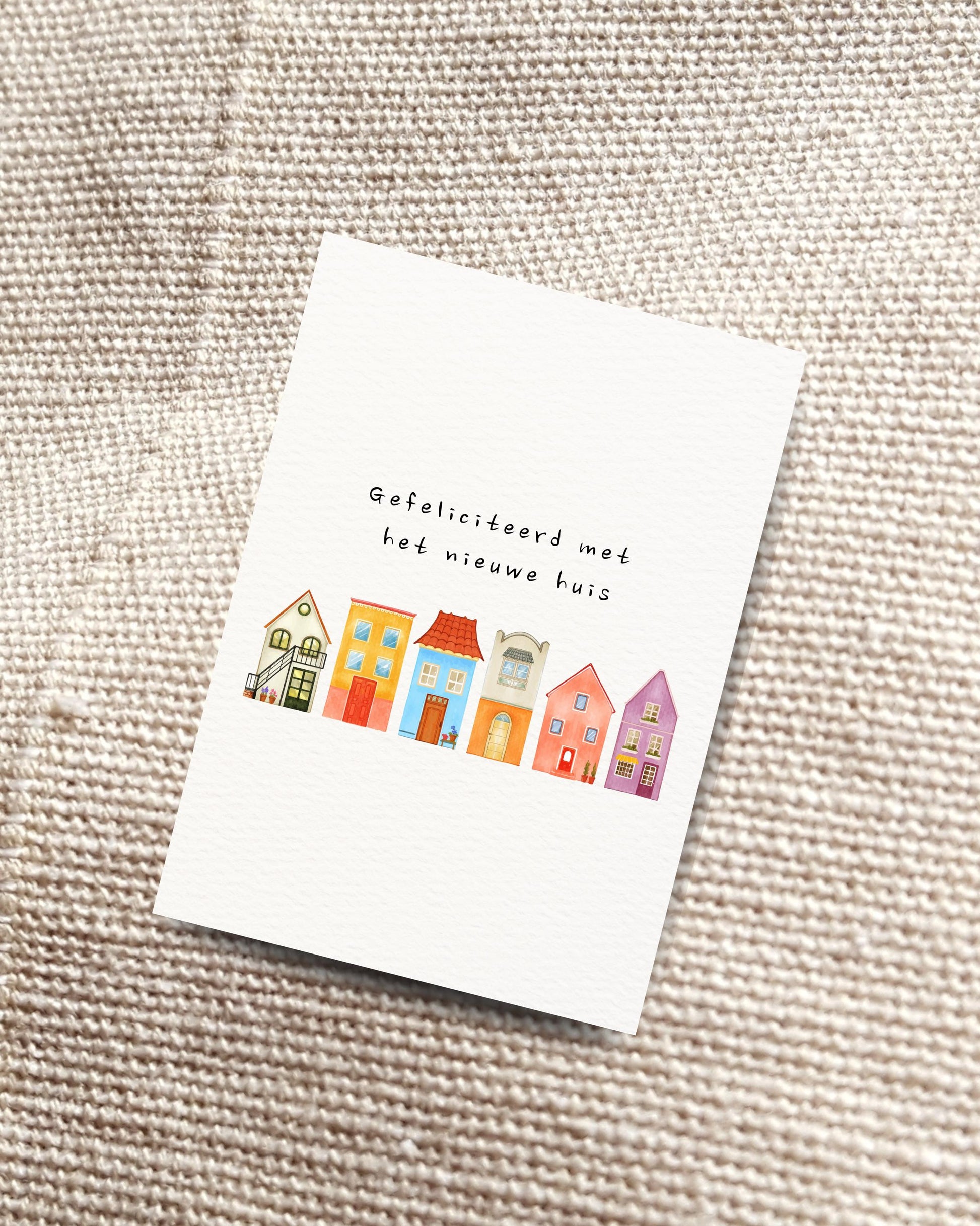 Een vrolijke verhuiskaart met gekleurde huizen en de tekst “Gefeliciteerd met het nieuwe huis”. Perfect om iemand succes en geluk te wensen in een nieuw thuis.