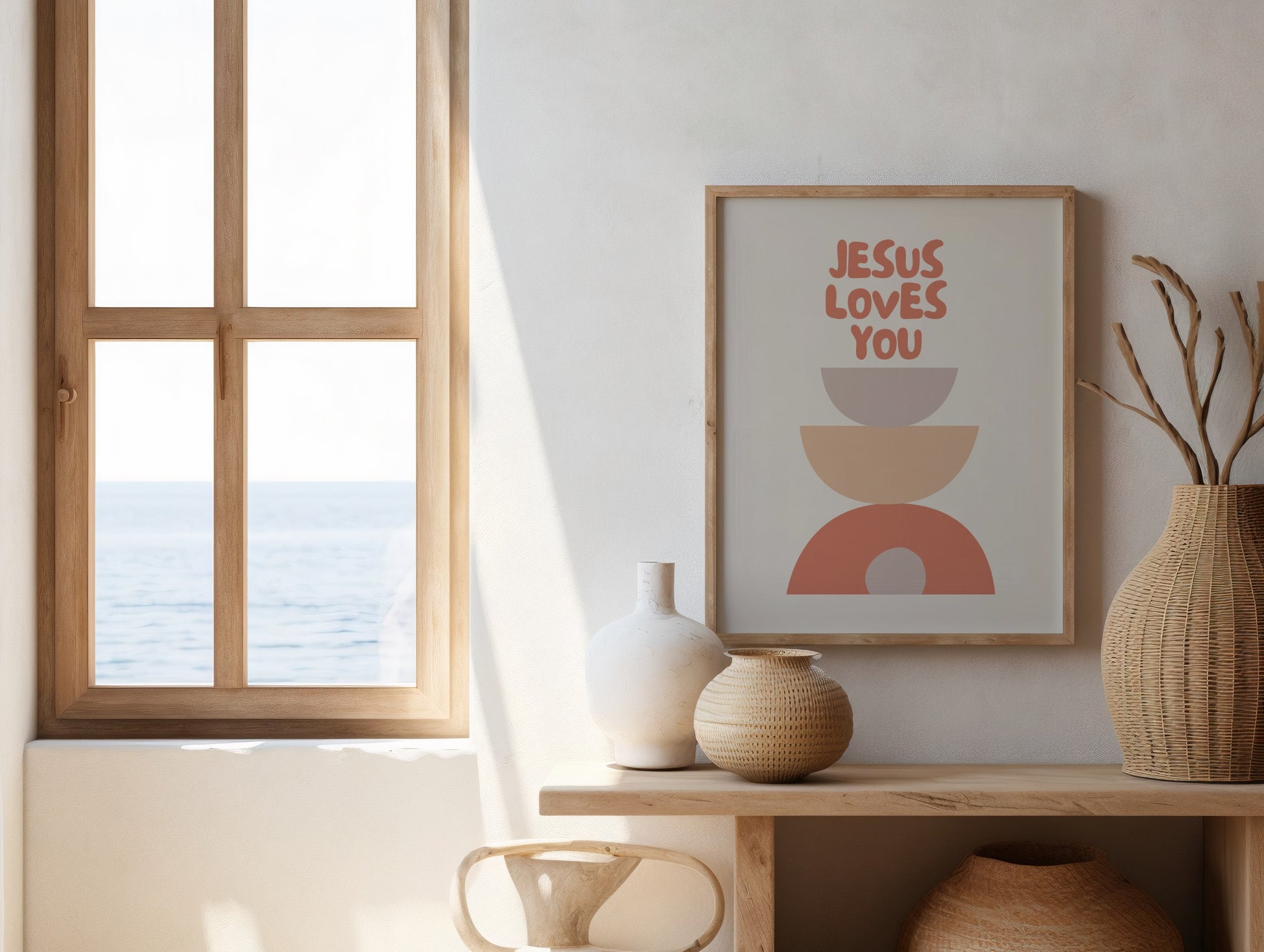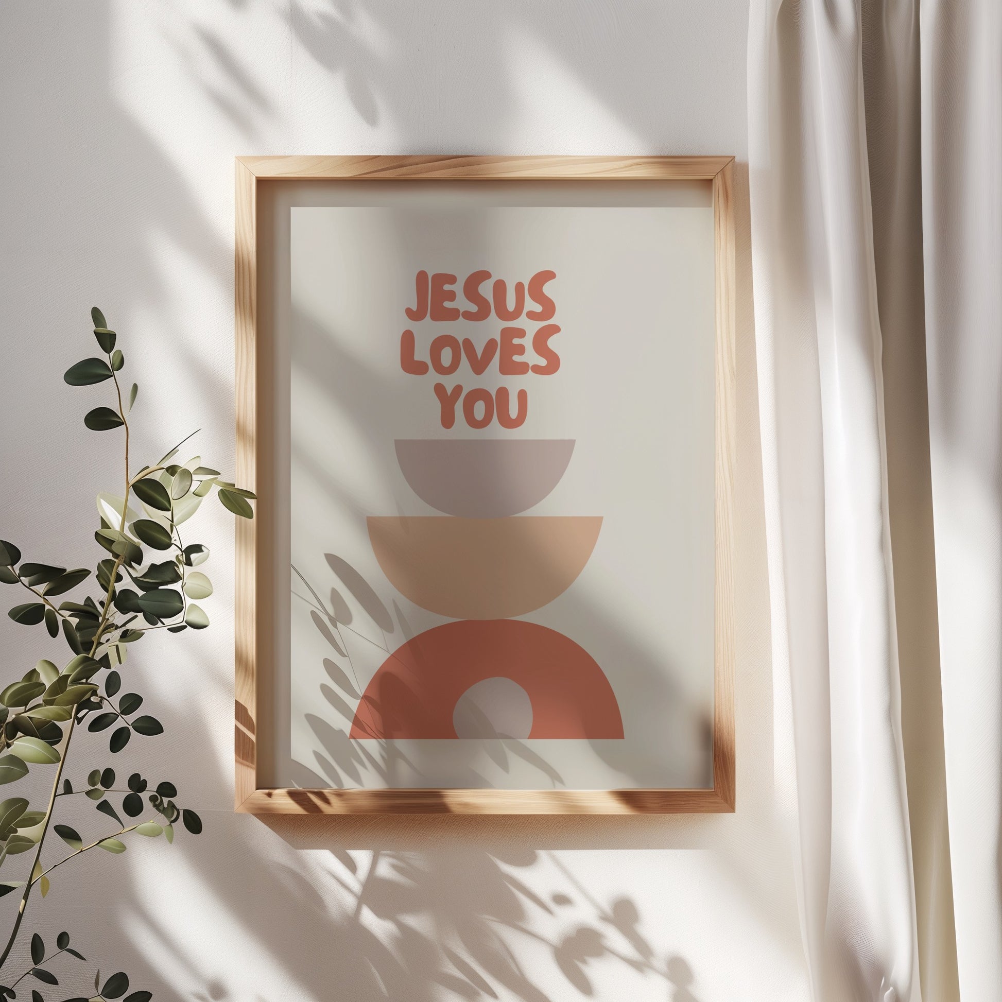 A soft, contemporary poster featuring the message Jesus loves you, designed with warm tones and simple shapes. The minimal design brings a sense of calm and hope into your home, offering a gentle reminder of God’s love in any space.