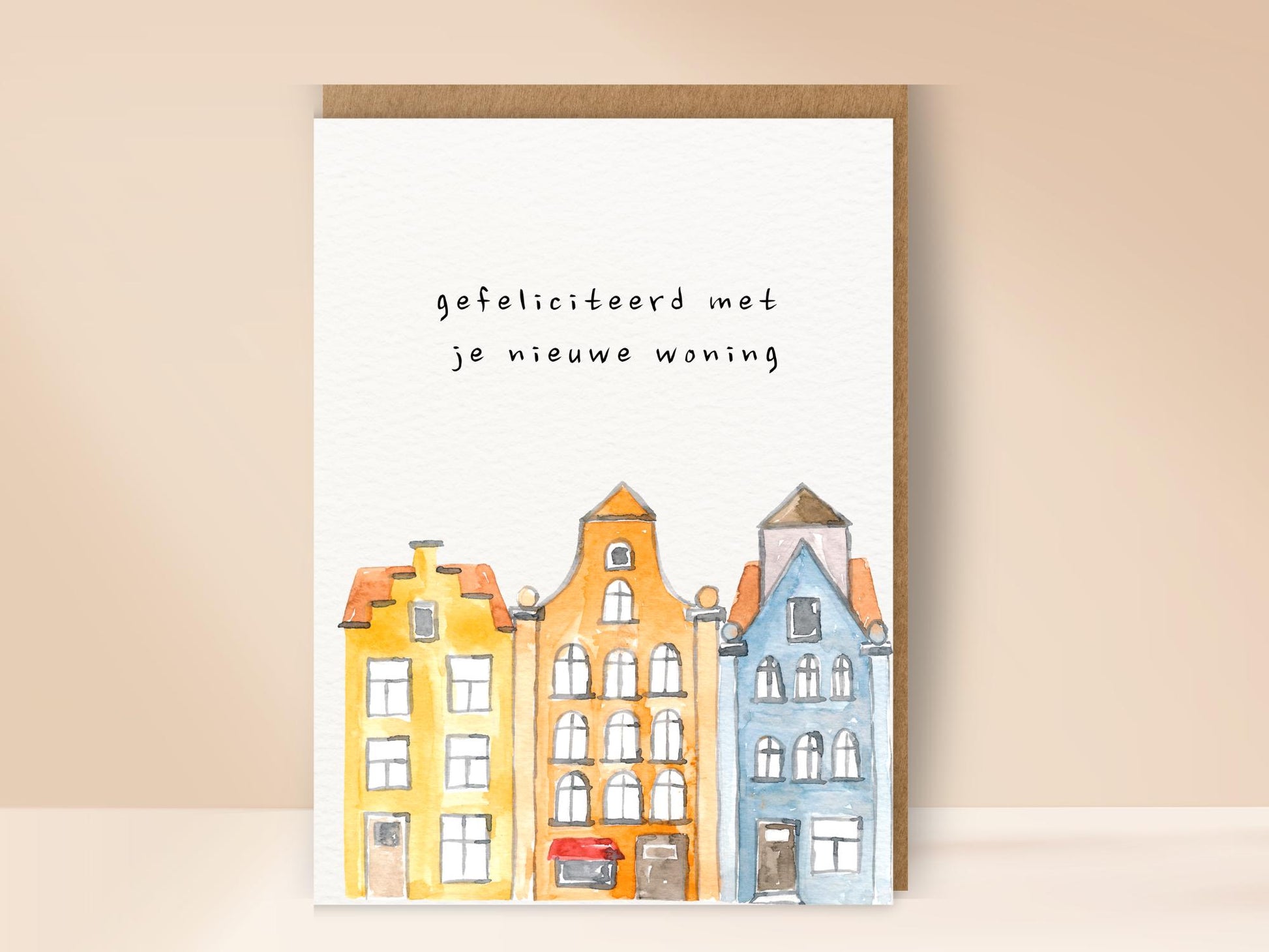 Een stijlvolle verhuiskaart met kleurrijke gevelhuizen en de tekst “Gefeliciteerd met je nieuwe woning”. Perfect om iemand een warm welkom te wensen in hun nieuwe huis.