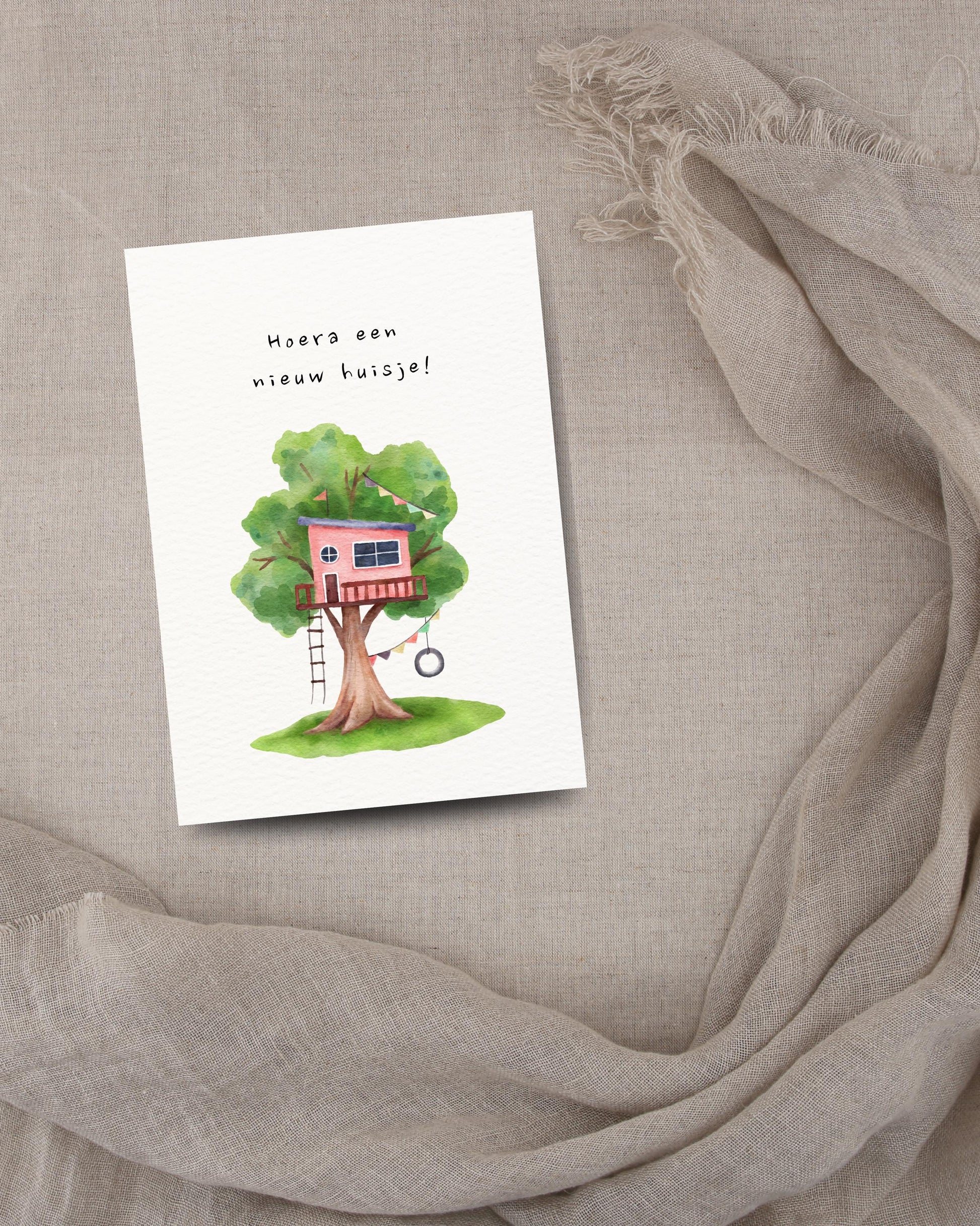 Een originele verhuiskaart met een kleurrijke boomhut en de tekst “Hoera een nieuw huisje!”. Leuk en speels om iemand te feliciteren met hun nieuwe thuis.