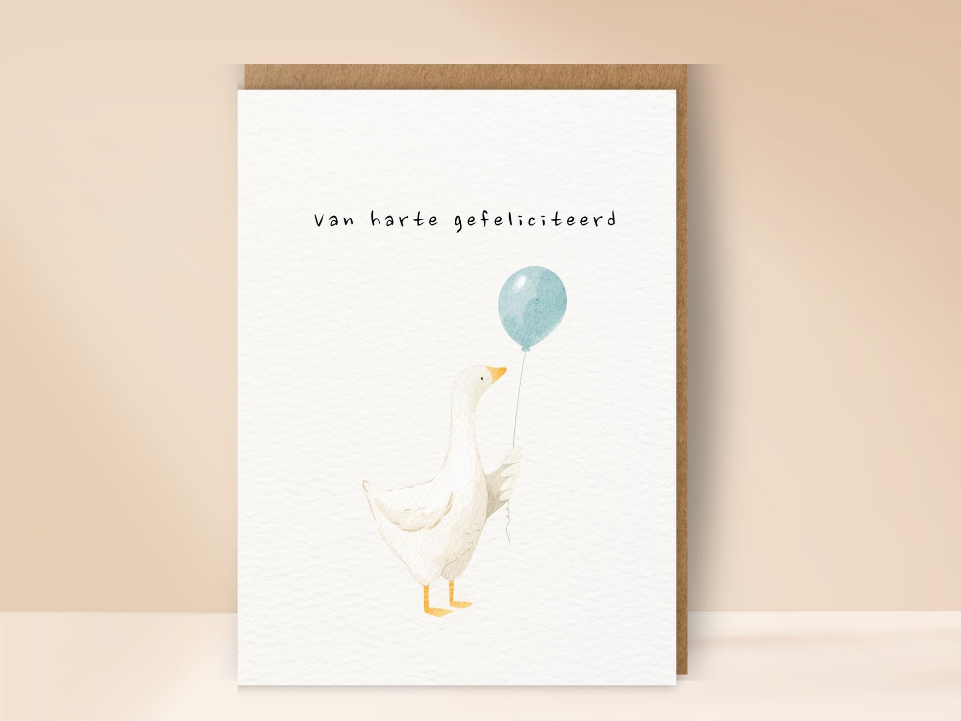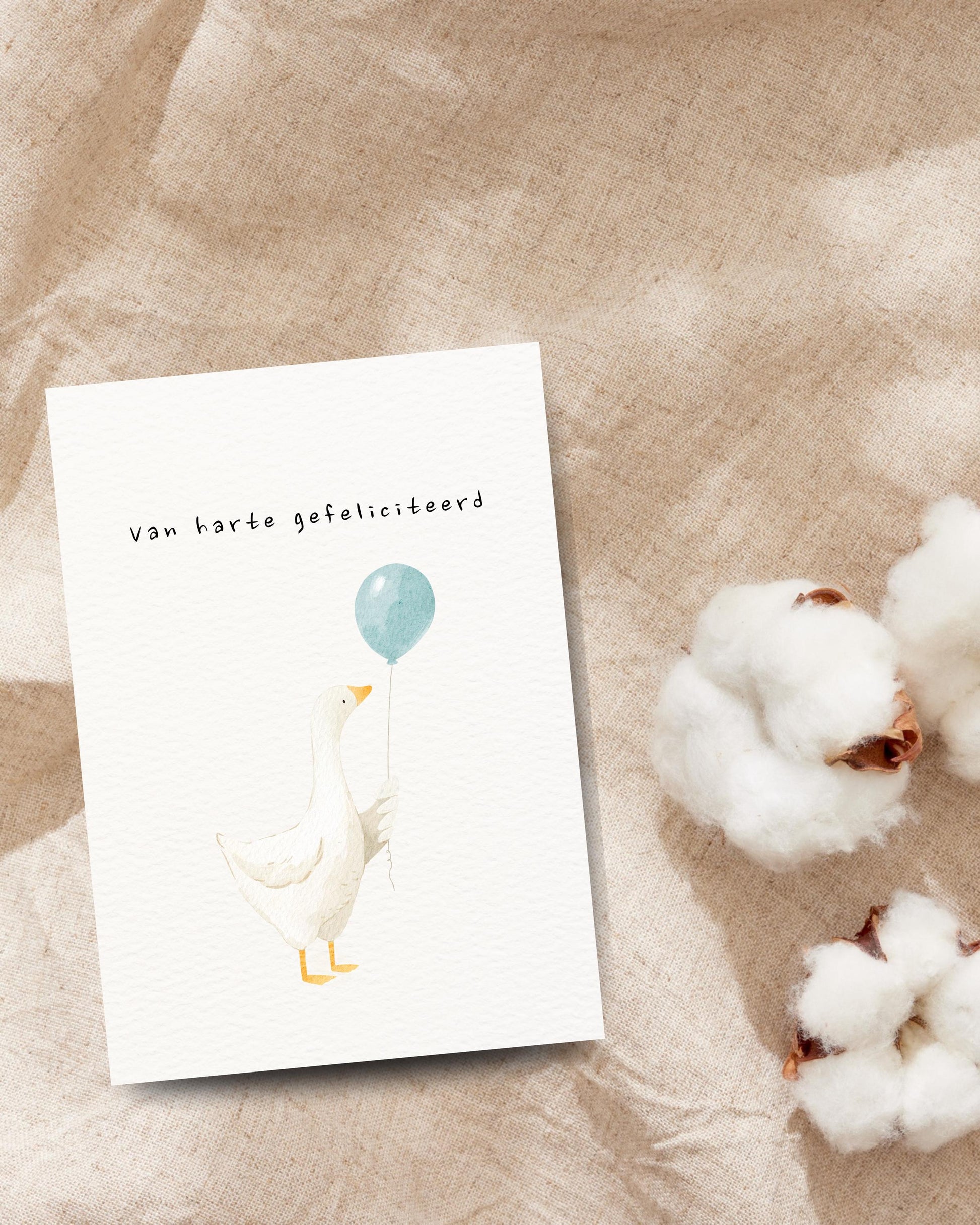 Een vrolijke verjaardagskaart met een lieve gans die een ballon vasthoudt, perfect om iemand blij te verrassen op zijn of haar verjaardag of bij een andere gelegenheid! Deze minimalistische illustratiekaart is uniek en tijdloos, en past bij jong en oud.