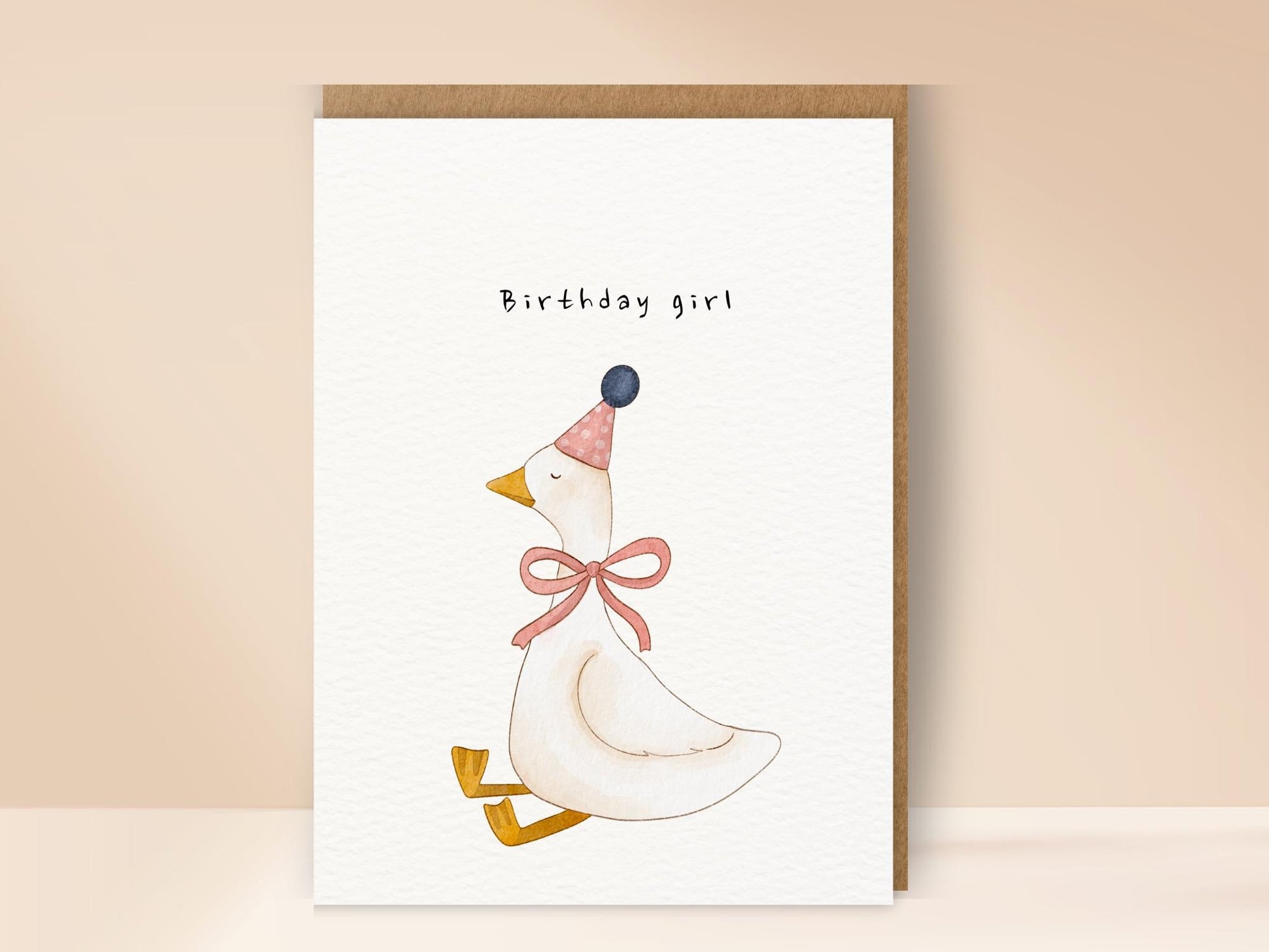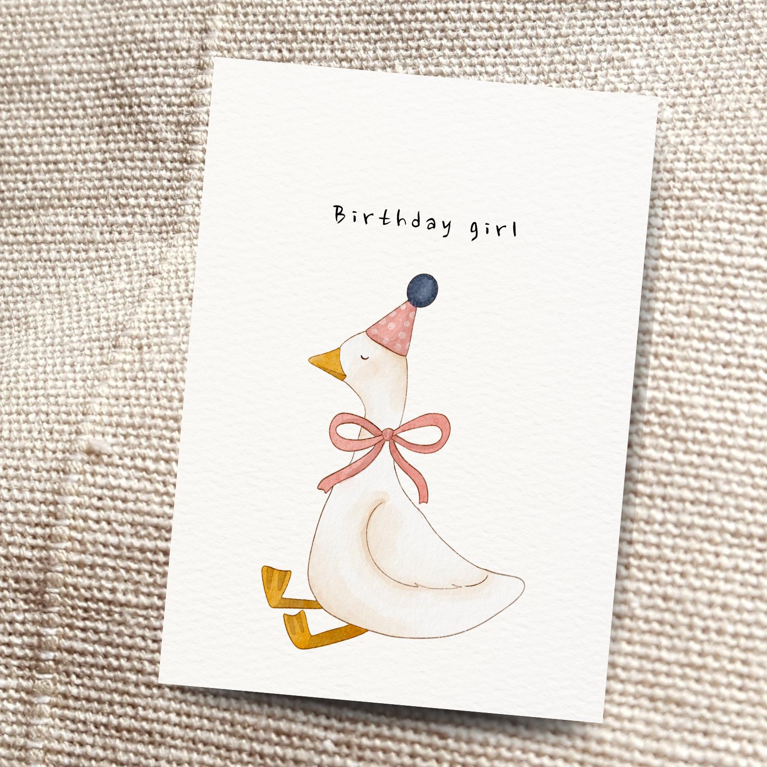 Een vrolijke verjaardagskaart voor meisjes, met een feestelijk eendje met strik en feesthoed. Ideaal om een verjaardag extra bijzonder te maken.