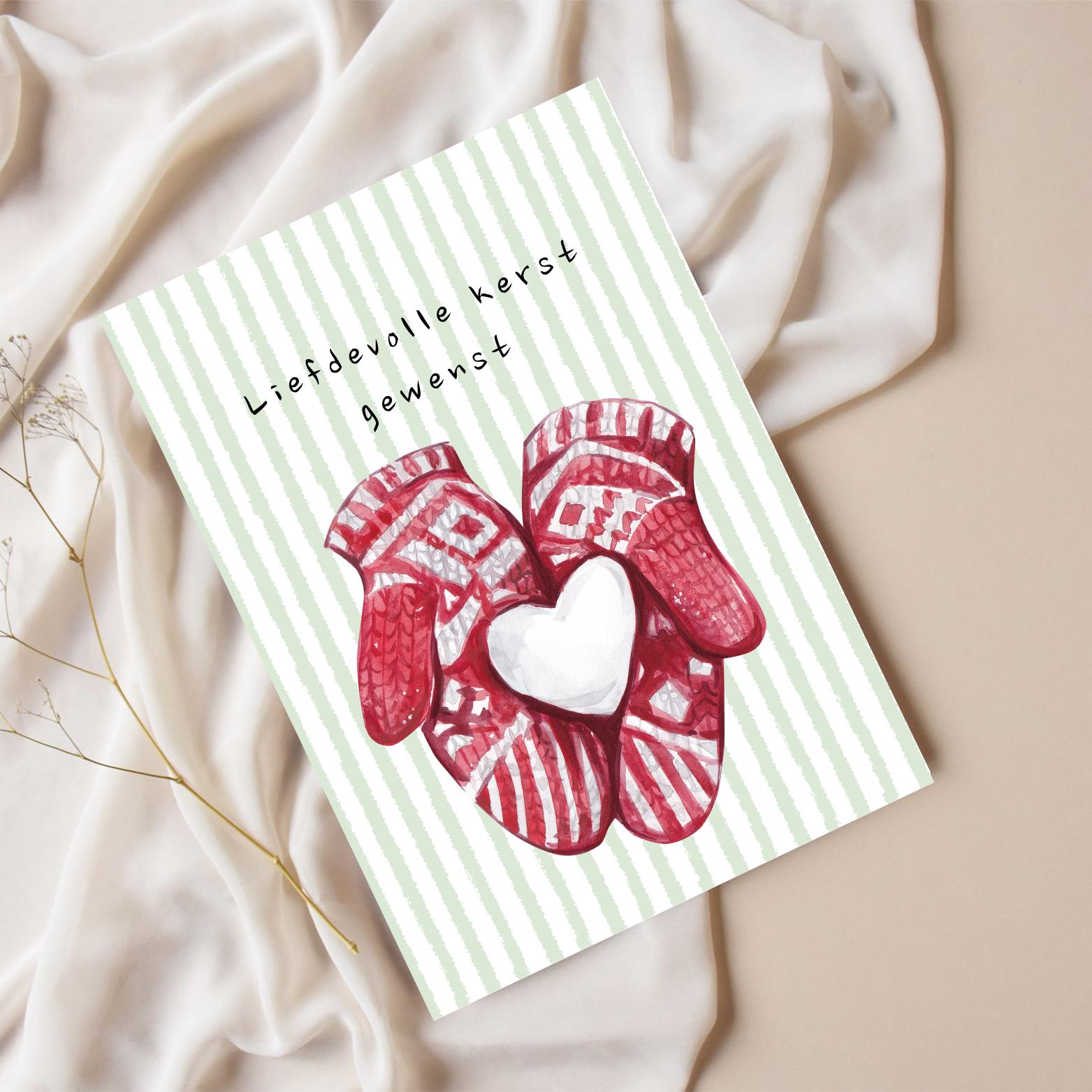 Een sfeervolle kerstkaart met rode wantjes en een hart. Perfect om een liefdevolle kerstboodschap te delen.