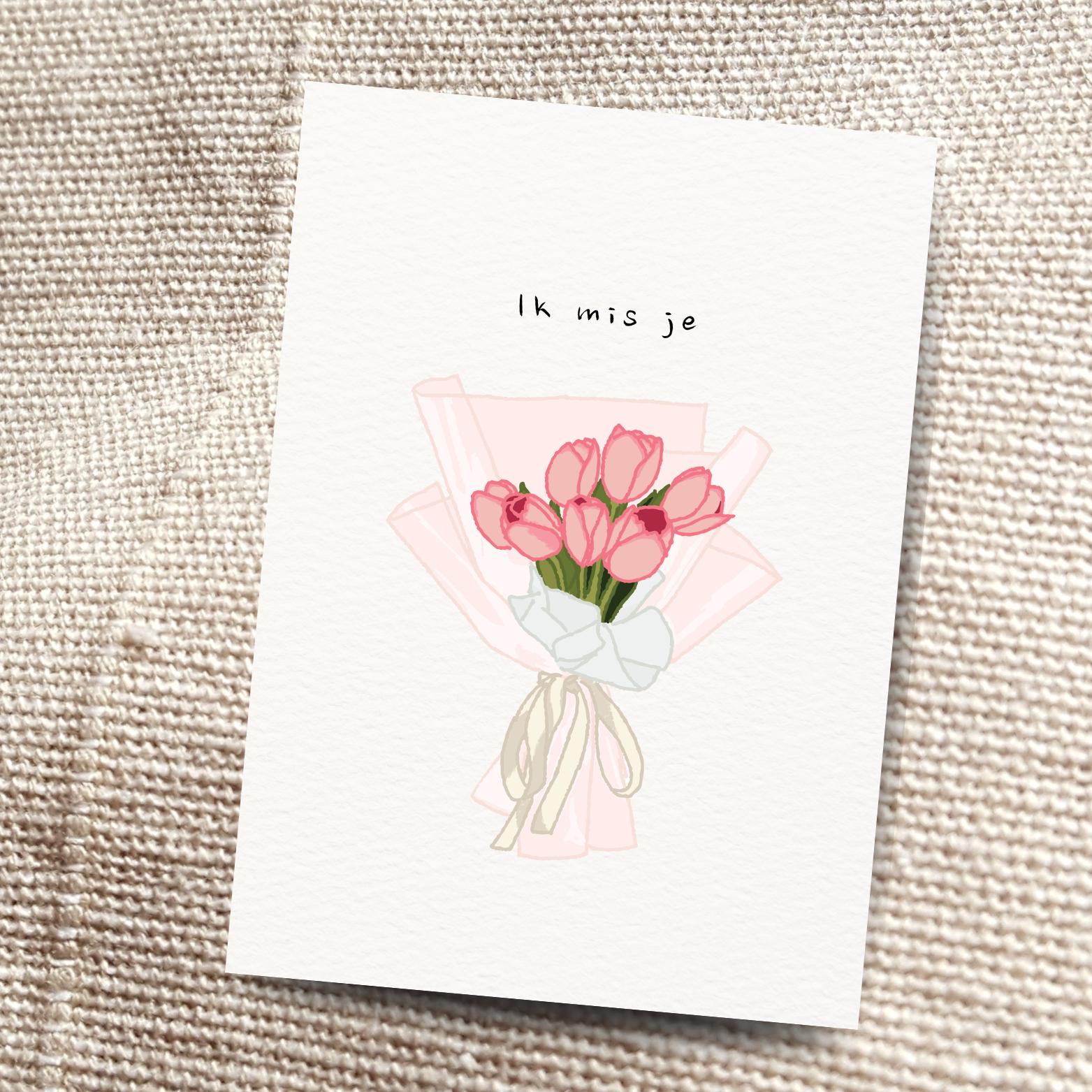 Een zachte en liefdevolle kaart met een boeket roze tulpen. Ideaal om iemand te laten weten dat je aan hem of haar denkt en die persoon mist.